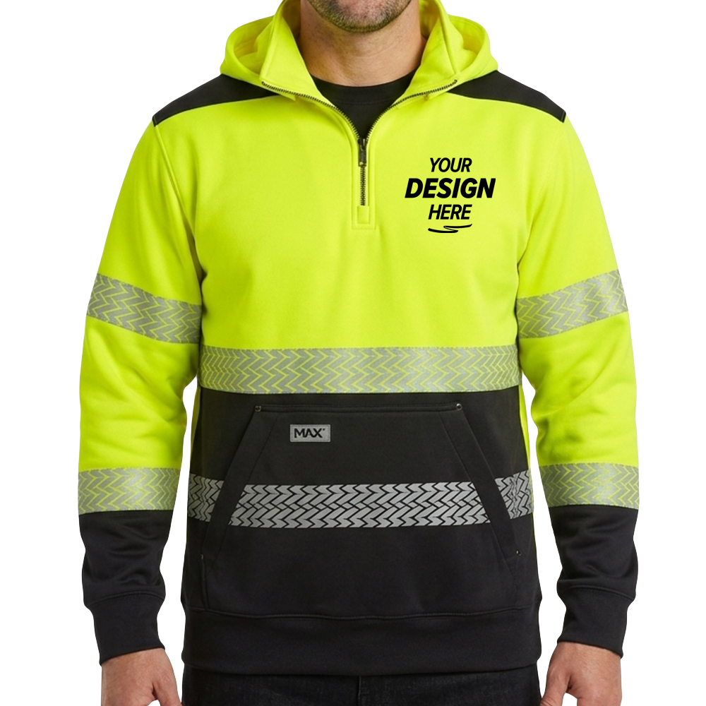 Built for tough jobs and harsh conditions, the Max Apparel ANSI Class 3 Quarter-Zip Hooded Sweatshirt delivers high visibility, durability, and all-day comfort. Crafted from heavyweight polyester with DuPont™ rain and stain protection, it helps keep you dry, clean, and focused on the task at hand. Reinforced shoulder and elbow patches add extra durability in high-wear areas, while segmented reflective tape provides enhanced flexibility and visibility. Perfect for construction, roadwork, and industrial environments, this hoodie is designed to perform when it matters most.