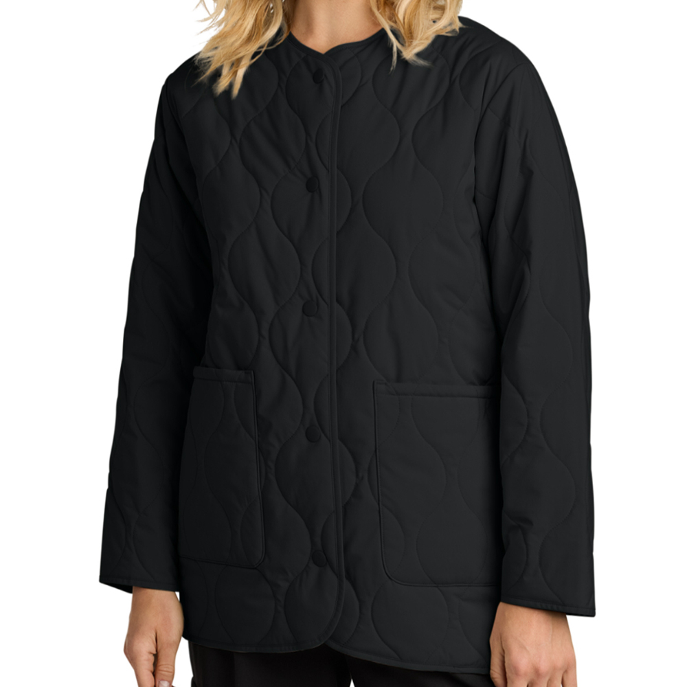 Refined, versatile, and built for year-round wear, the Mercer+Mettle Women’s Quilted Liner Jacket delivers lightweight warmth with a polished, modern edge. Designed with a classic onion quilt pattern and a sleek silhouette, it transitions effortlessly from standalone style to layered performance. A durable water-repellent (DWR) finish helps protect against light weather, making it perfect for commuting, travel, and everyday professional wear. Clean lines and a smooth surface make it ideal for custom branding—perfect for corporate apparel, team gear, and elevated promotional programs.
