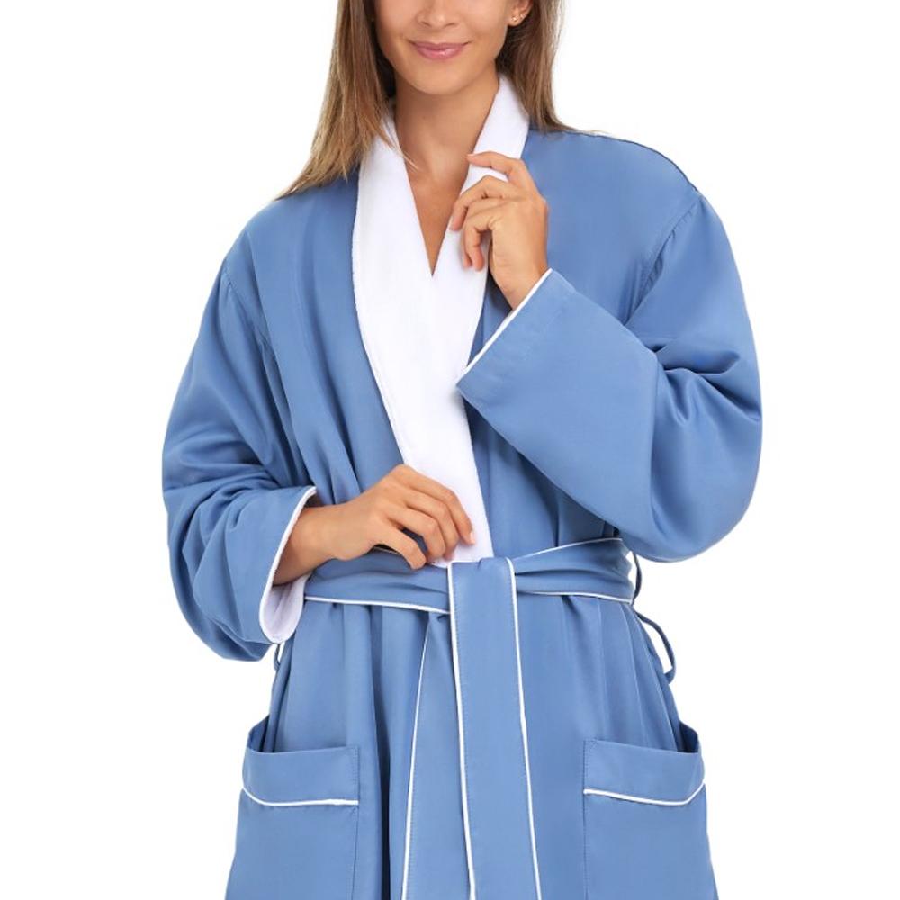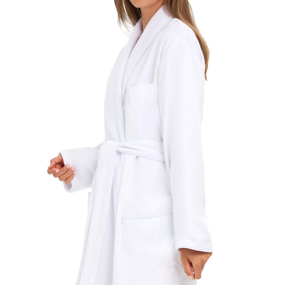 The "gold standard" microfiber robe. Featured in the best hotels and spas, these peached microfiber robes are designed for the ultimate in luxury, comfort and toughness. Soft, yet extremely durable Peached microfiber (brushed) outer shell. Complemented by a plush super soft 100% poly microfiber inner liner. Bathrobe details include adjustable belt loops for flexible belt height, patch front hip pockets, tonal accent piping on shawl and cuffs and hanger loop for convenient storage. Featuring a welted breast pocket and fully closed hem, insuring tangle-free laundering.