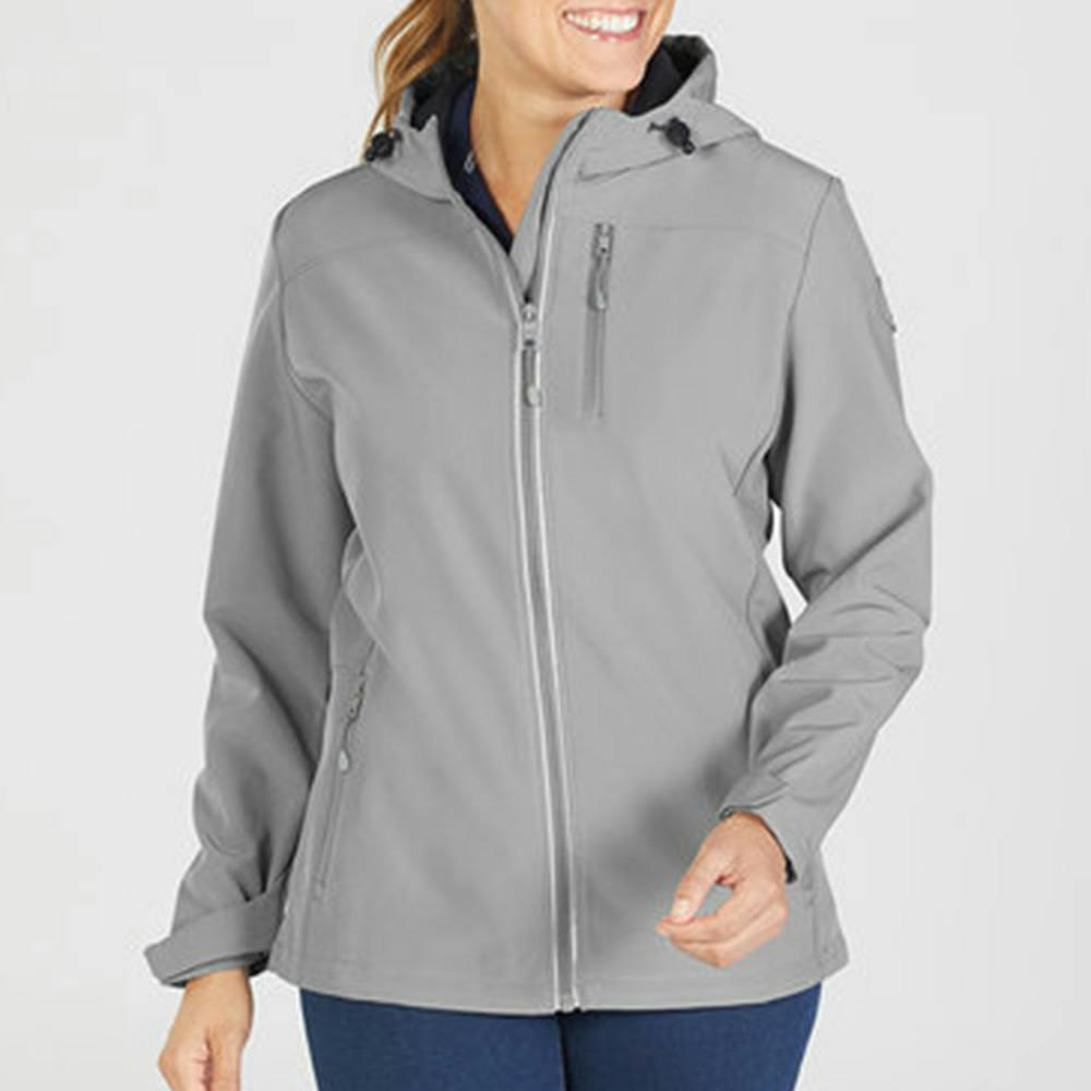 Nautica Women's Wavestorm Softshell Jacket — a sleek, stretch-knit (94% polyester / 6% spandex) outer layer built for comfort and protection. Wind- and water-resistant with an adjustable hood (bungees & toggles), internal draft flap, hem cinch-cord and adjustable cuffs, it seals out the elements while keeping a tailored fit. Reflective front and back details plus multiple pockets (left-chest and inner storage) make it ideal for evening commutes, travel, and outdoor events. Add your logo or design for a polished branded jacket—features include Nautica high-density hood print and a branded left-sleeve patch.