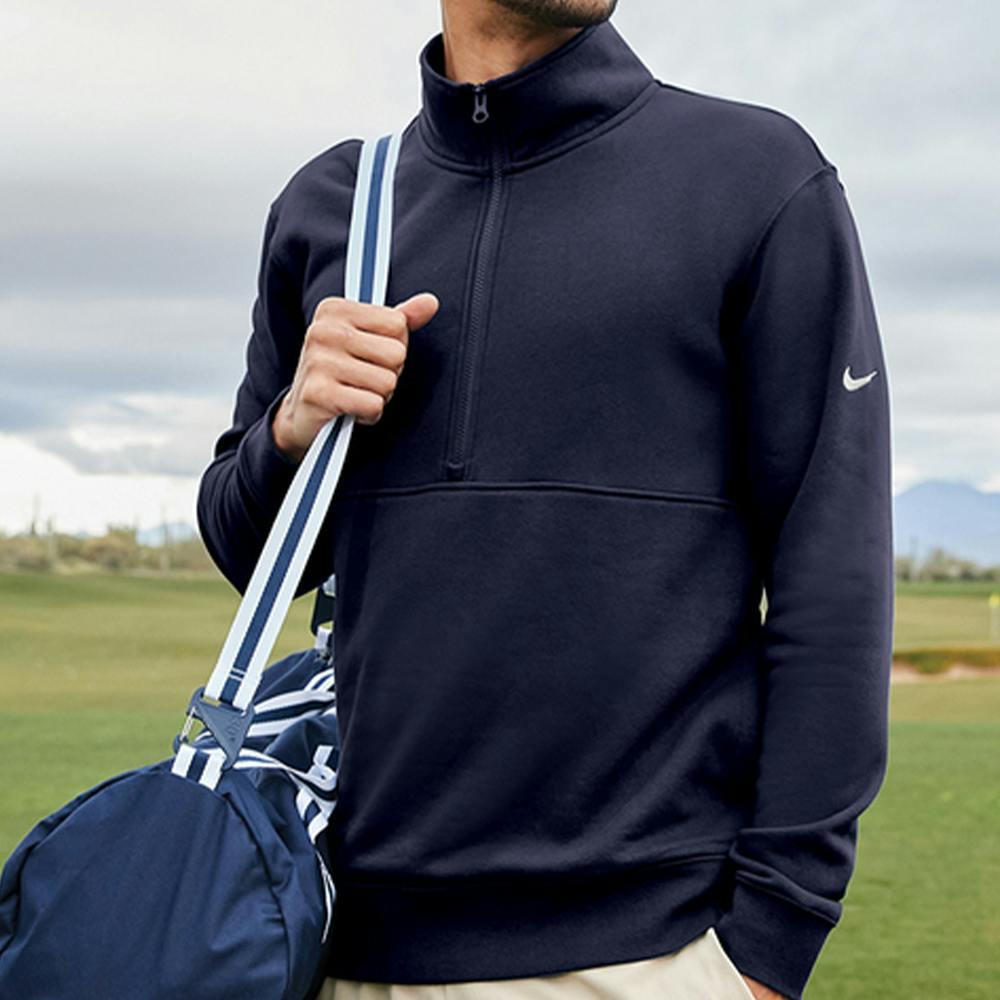Nike Club Fleece Sleeve Swoosh Half-Zip has an elevated look which makes it perfect for work or play. It’s a sustainable choice with a blend of recycled polyester and organic cotton. Design details include a zip-through collar with dyed-to-match zipper. Side pockets. Rib knit cuffs and hem. A contrast Swoosh logo is embroidered on left sleeve. Just add your artwork!