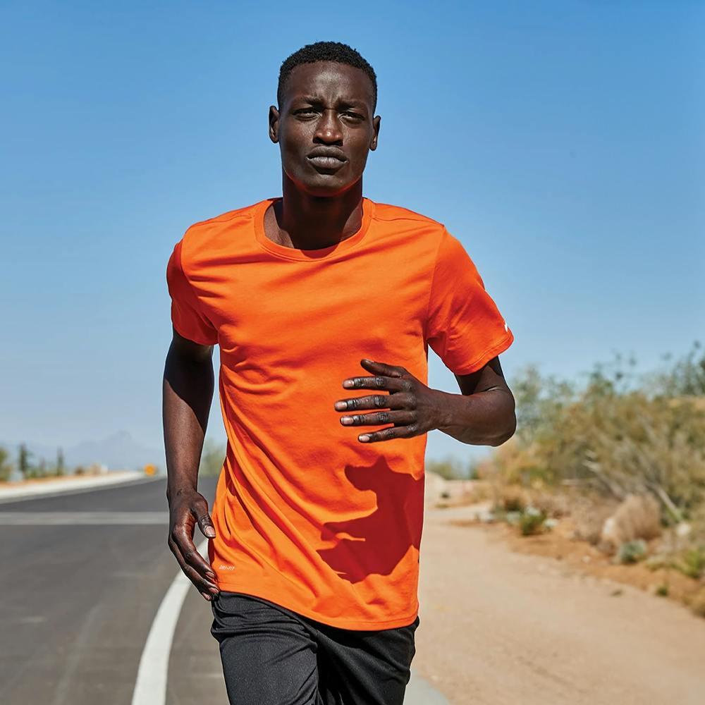 Stay dry and look sharp in the Nike Dri‑FIT Cotton/Poly Tee — a 60/40 moisture‑wicking short‑sleeve that delivers tag‑free comfort and long‑lasting durability. Contrast heat‑transfer logos and double‑needle stitching give a polished, athletic look that’s perfect for golf, team uniforms, corporate giveaways, and other promotional uses — all ready for your custom design. *Please note: available to ship within the United States only.*