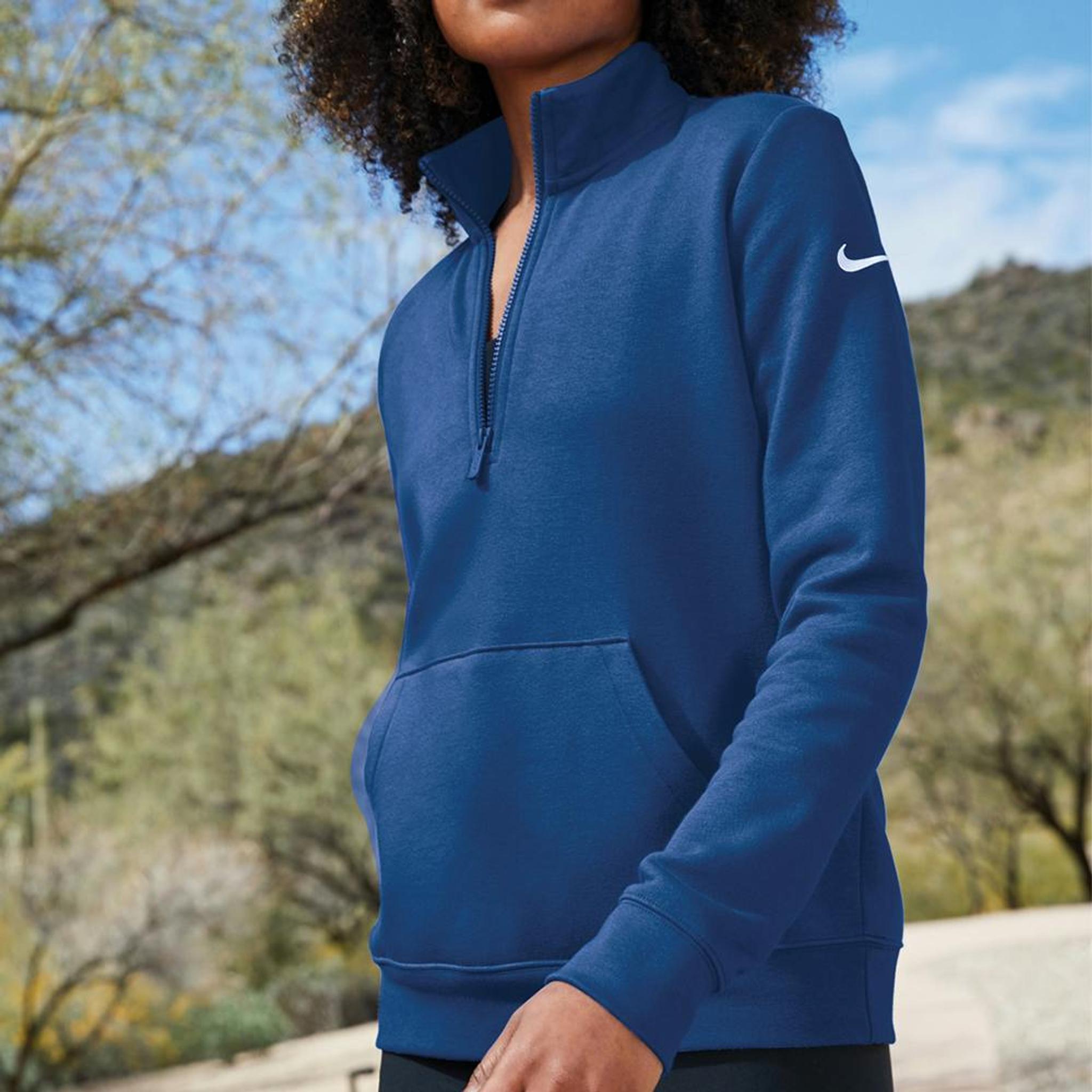 Nike Women's Club Fleece Sleeve Swoosh Half-Zip has an elevated look which makes it perfect for work or play. It’s a sustainable choice with a blend of recycled polyester and organic cotton. Design details include a zip-through collar with dyed-to-match zipper. Side pockets. Rib knit cuffs and hem. A contrast Swoosh logo is embroidered on left sleeve. Just add your artwork!