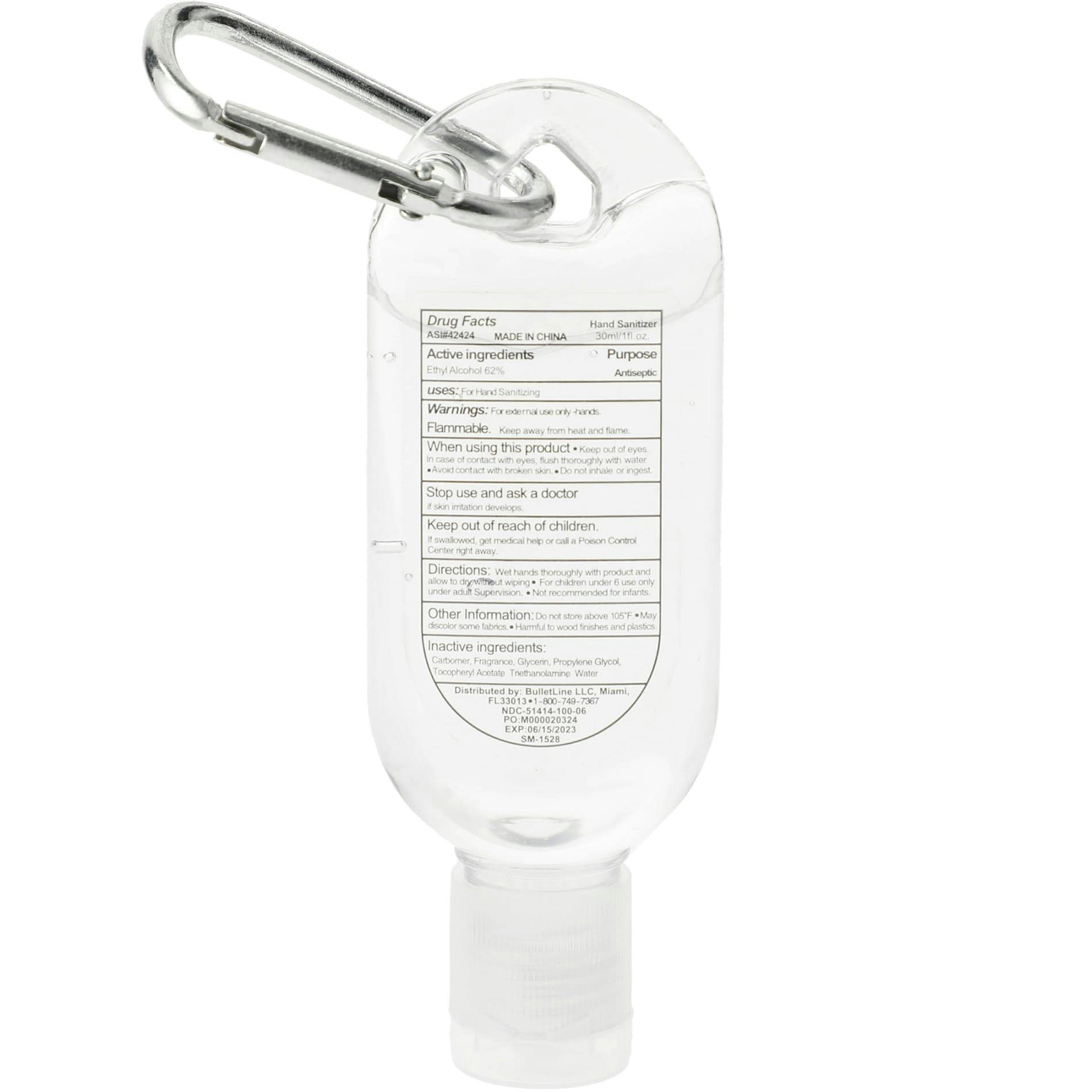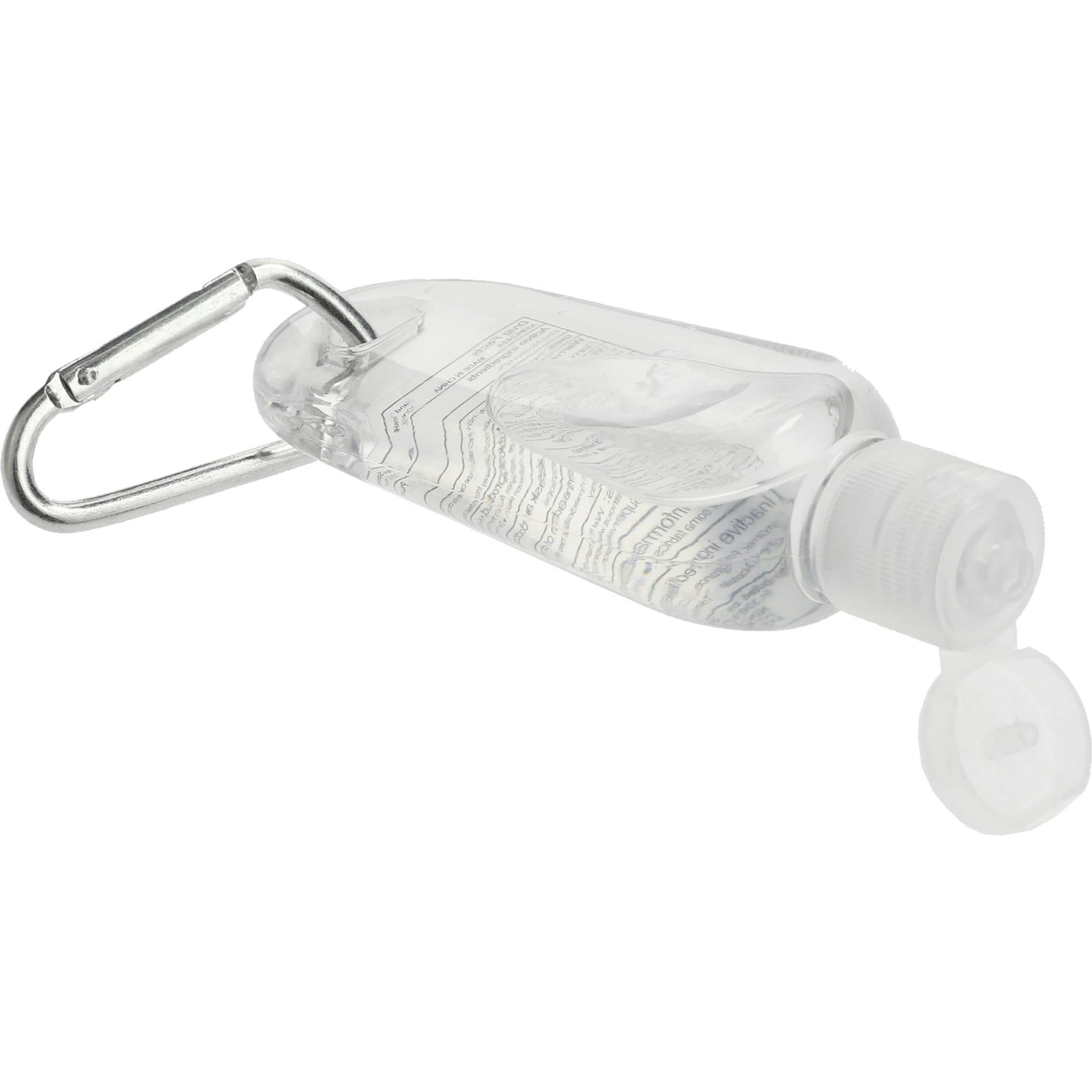 The 1oz Clip-N-Go Hand Sanitizer is an alcohol-based, 1 ounce (30ml) hand sanitizer in a tottle bottle with a flip-top lid and a 62% alcohol content. It includes a metal mini-carabiner that matches the lid color. Meets FDA requirements and is available for shipment in contiguous US only (shipping to Alaska, Hawaii & Puerto Rico NOT available). See General Information page for additional air shipment charges. Multi-color decoration available.