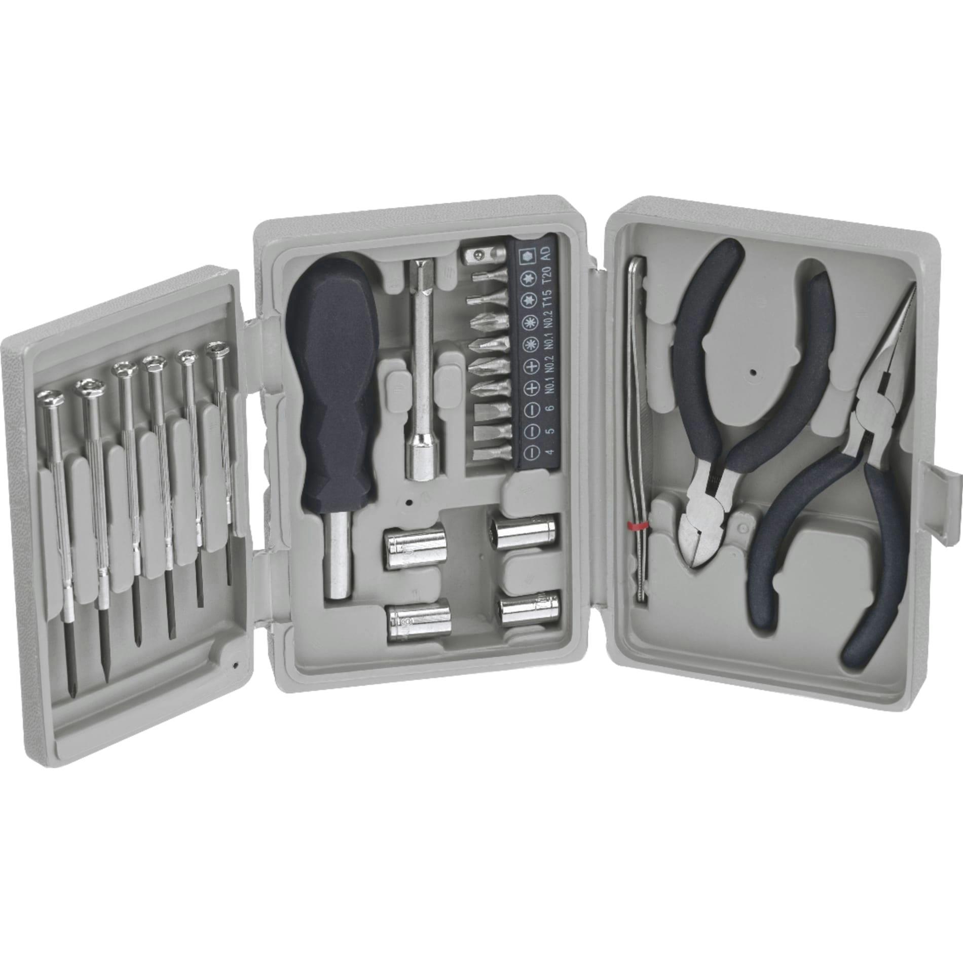 The 26 Piece Deluxe tool Kit includes 6 precision screwdrivers, an extension rod, a bit driver with a plastic handle, a 10-piece screwdriver bits in a bit holder, needle-nose pliers and diagonal wire cutters with matte grip handles, 4 wrench sockets and a pair of tweezers. The 4 wrench socket sizes are 7, 8, 9, and 10 MM. It also includes a tri-fold heavy duty case with a snap closure.
