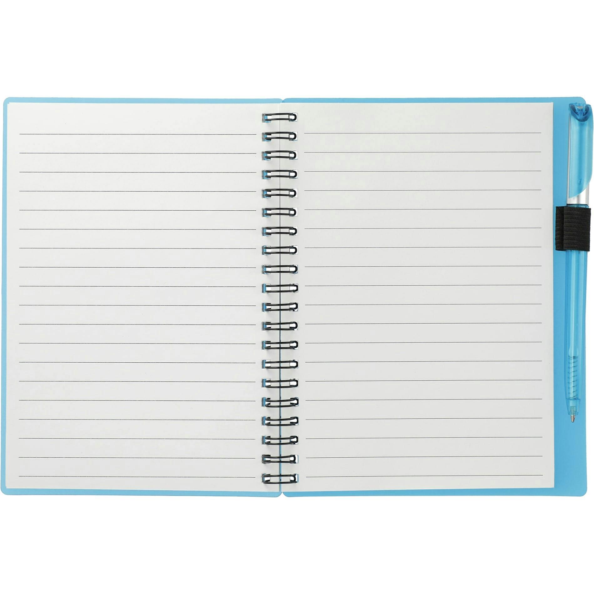 The 5.5" x 7" Star Spiral Notebook has a clear window ID/card slot on the front cover with a matching ballpoint pen. It includes a twist-action ballpoint pen with elastic pen loop, as well as 70 white ruled pages. Hard, flexible cover. The window area can hold cards or photos that can be 2” x 3.5”. A pen imprint is not available and all pens are packed separately.