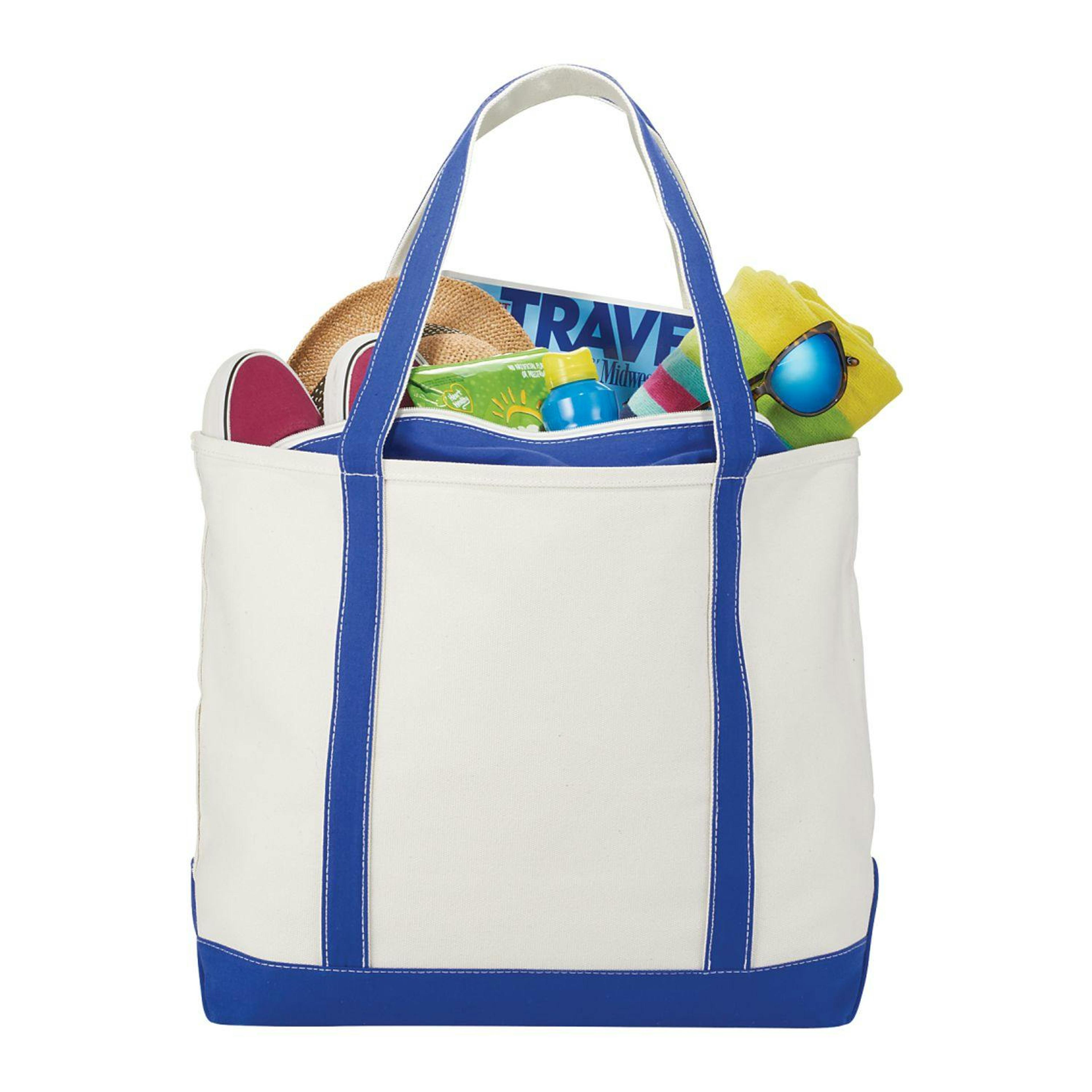 Large Heavyweight Cotton Canvas Zippered Tote — Made from premium bleached cotton, this classic boat-style tote is built for travel, outdoor events, trade shows and everyday errands. Zippered main compartment keeps belongings secure, plus an open interior pocket for phone/keys and 11" drop handles for comfortable over-shoulder carry. Roomy 23" W x 15" H x 7" D capacity, reusable and available in multiple colors — a durable, customizable promotional tote bag ideal for giveaways and retail.