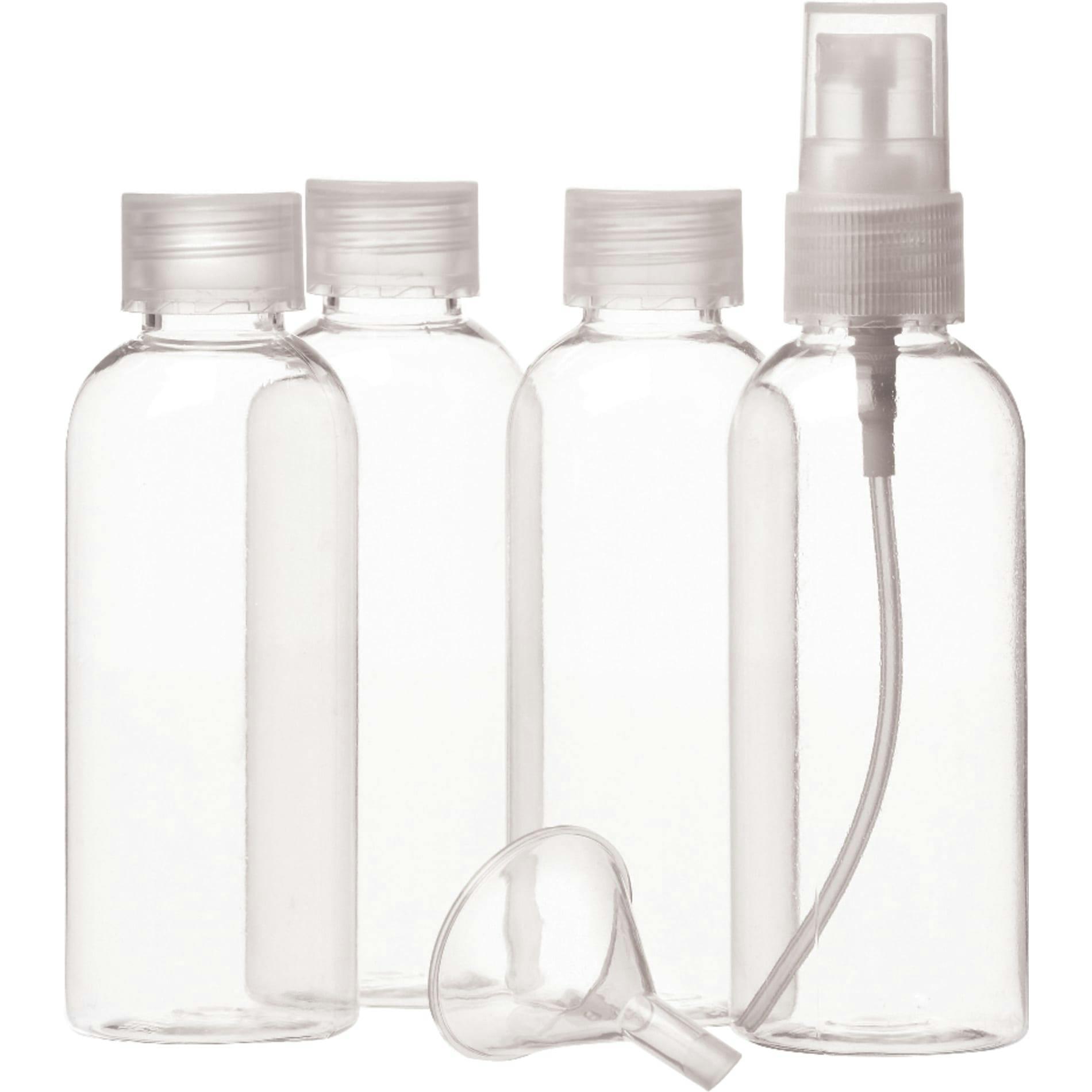 Carry-On Kit — a TSA-friendly, clear PVC zip-top pouch that keeps toiletries organized and airport-ready. Includes three 80 mL refillable bottles, one 80 mL refillable spray bottle and a mini funnel — ideal for carry-on toiletries, weekend getaways, business trips and gym bags. Compact 7.12" H x 7.31" W x 1.50" D with secure zipper closure for easy security screening and leak-free packing. Bottles are not available for imprint. Brand: PCNA.