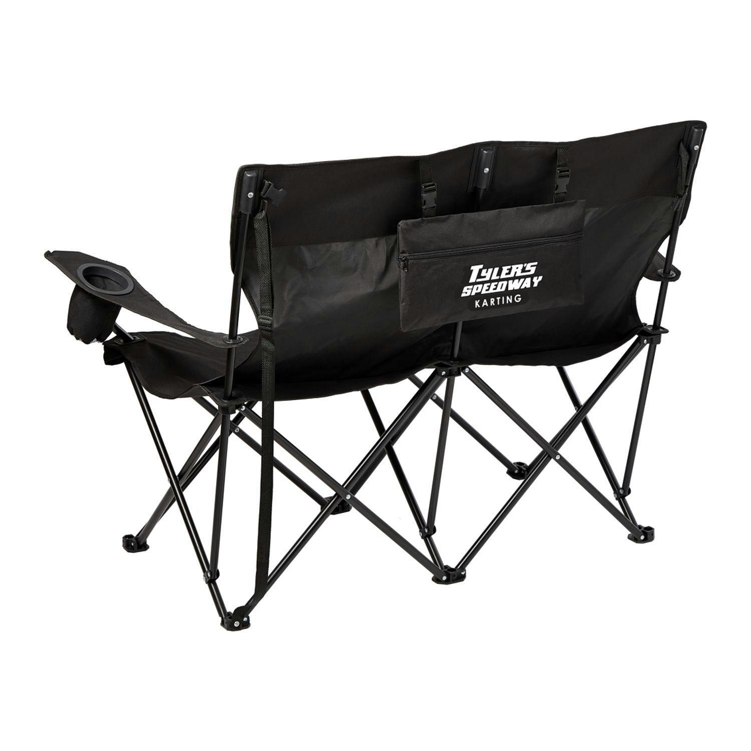 The Double Seater Folding Chair! Perfect for you and a plus one to sit together and enjoy the event together. This seat features cup holders on both sides and a convenient clip on pouch for easy storage. Holds up to 300lbs per seat!