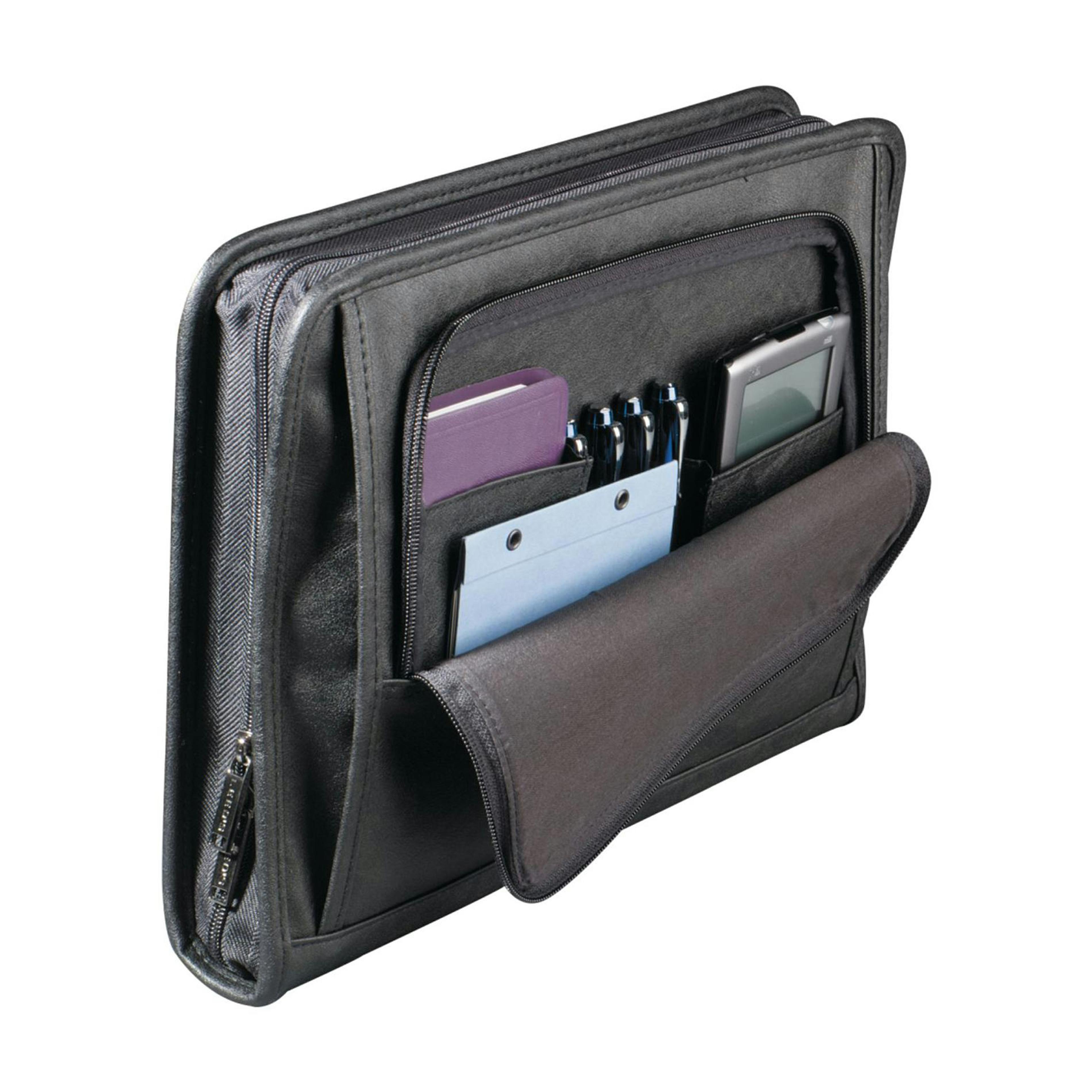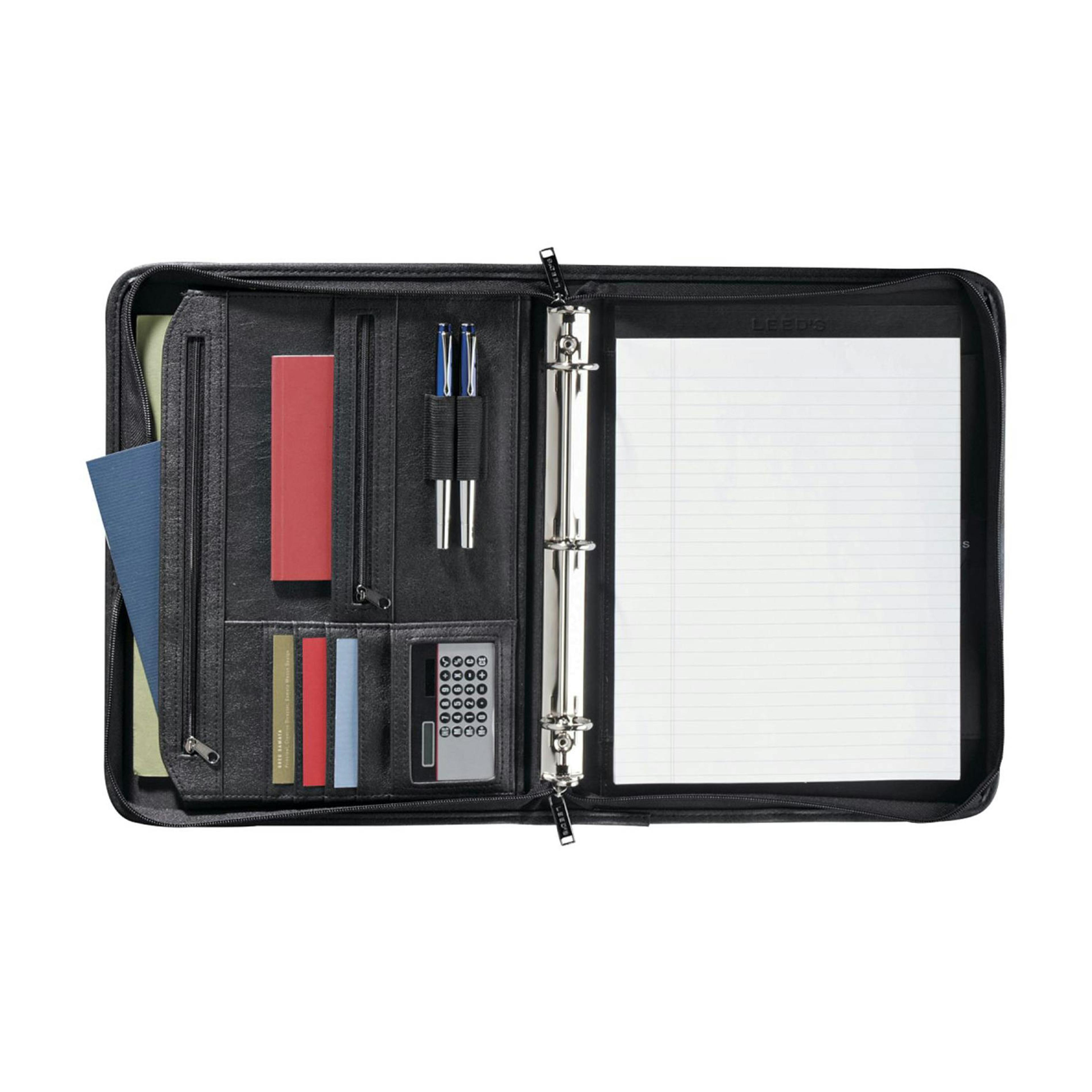 Stay organized and productive with this versatile zippered padfolio, designed to keep your essentials in one convenient place. It features a removable 1" three-ring binder, deluxe front and interior organizers, and an 8.5" x 11" writing pad (refill item #9091-0). A built-in pen loop ensures you always have a pen handy, while the secure zippered closure keeps everything protected. Perfect for meetings, school, or business travel—pen not included.