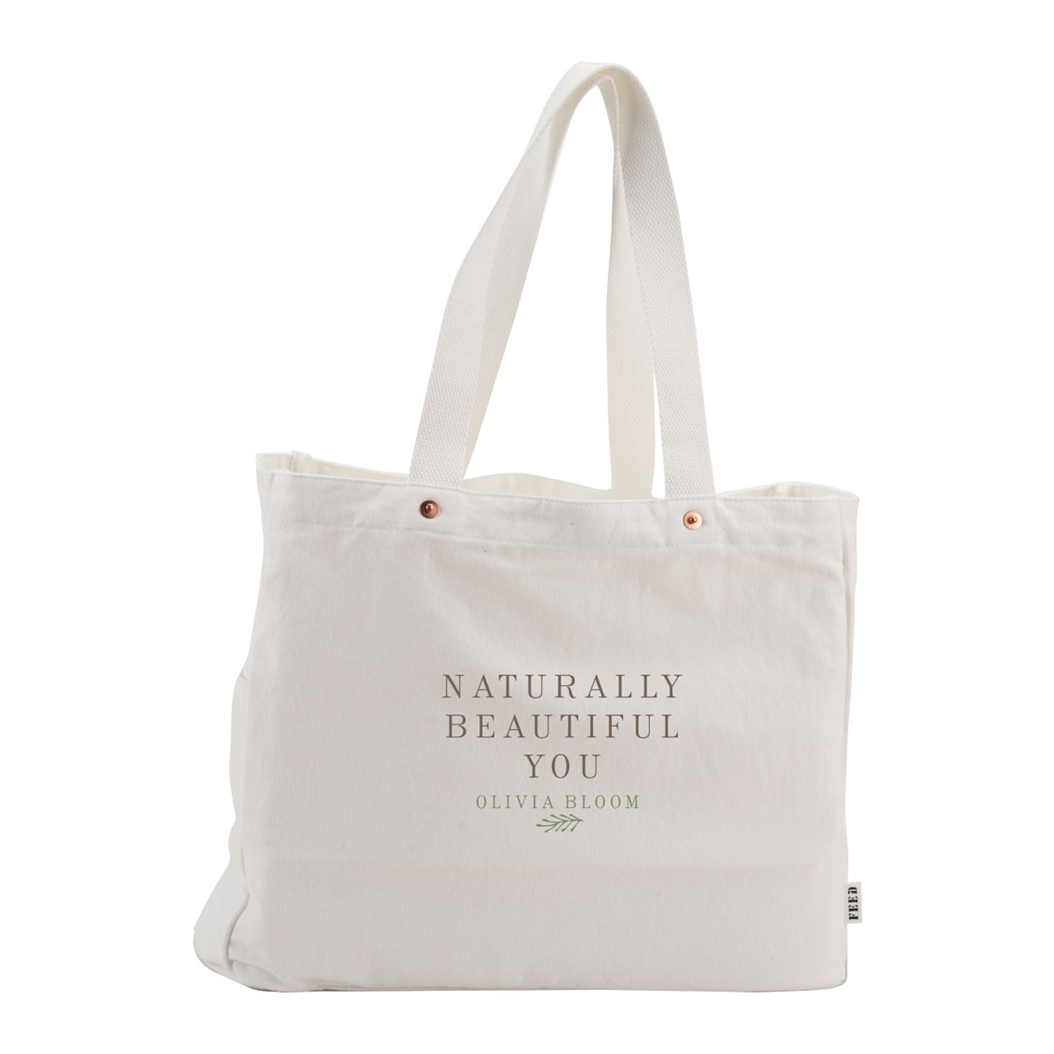 The FEED Medium Organic Cotton Rivet Tote Bag is more than just a tote – this tote helps provide 5 school meals to kids around the world. This stylish and versatile tote is perfect grab-and-go size for shopping at the market, carrying books, or a trip to the office. Features include an open main compartment for easy access, an exterior side pocket perfect for your daily essentials, and the FEED brand giveback message is printed on the interior. Crafted using 8oz. 100% GOTS Certified Organic cotton and stylish copper rivets – this tote is both durable and classic – designed to be kept in rotation and out of landfills.
