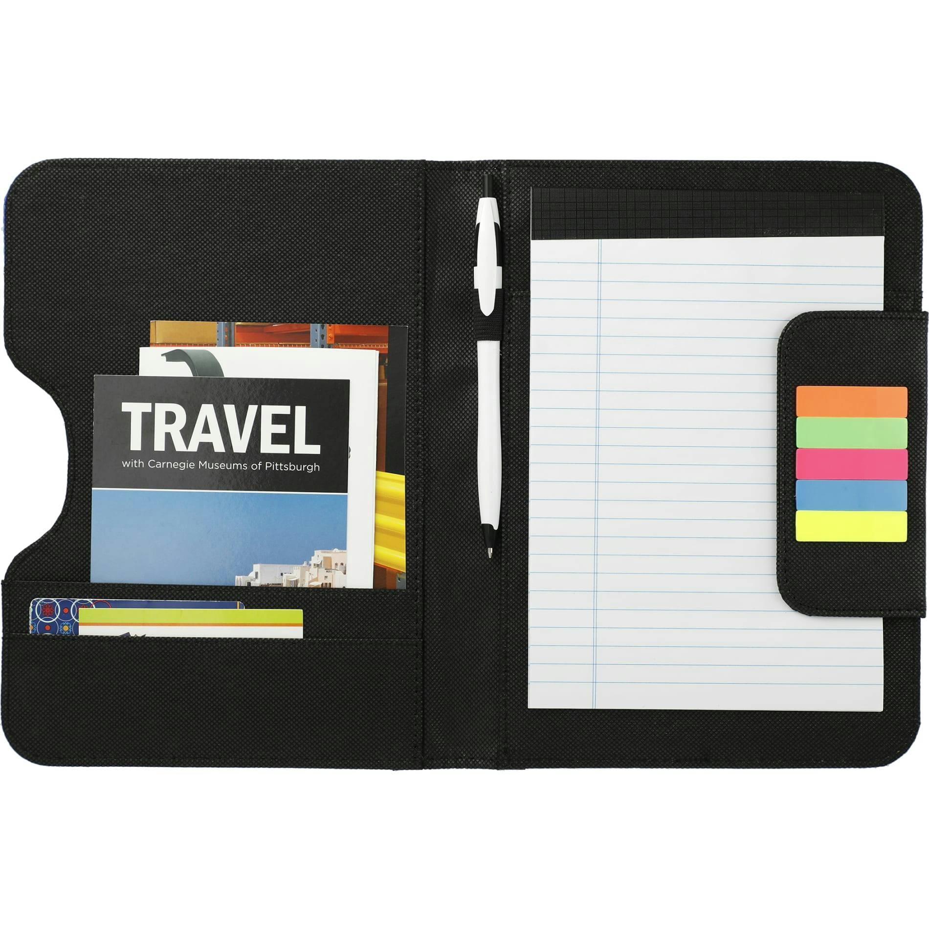 The Flare Organization Jr. Padfolio features five assorted color sticky flags and an inside cover panel that contains two business card pockets and an elastic pen loop. It also includes a refillable, 30 page and 8” x 5.5” notepad. A pen is not included.