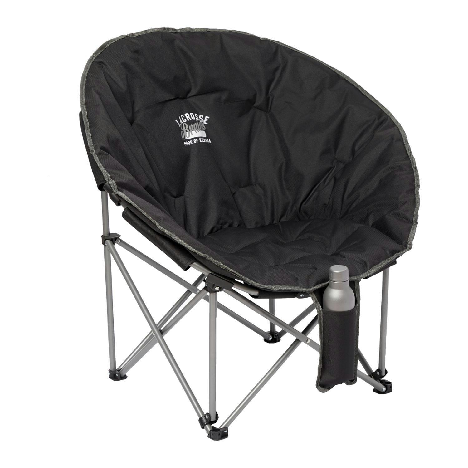 With an extra sturdy steel frame and durable 600D fabric this chair has a loading weight limit of 400lbs. Features a unique and comfortable rounded "moon" design with padded construction and a front tech pocket. Includes a study 600D carrying bag. Folded dimensions are 34"H X 10" W x 10" D. Unfolded dimensions are 25.6" H x 20" W x 20" D.
