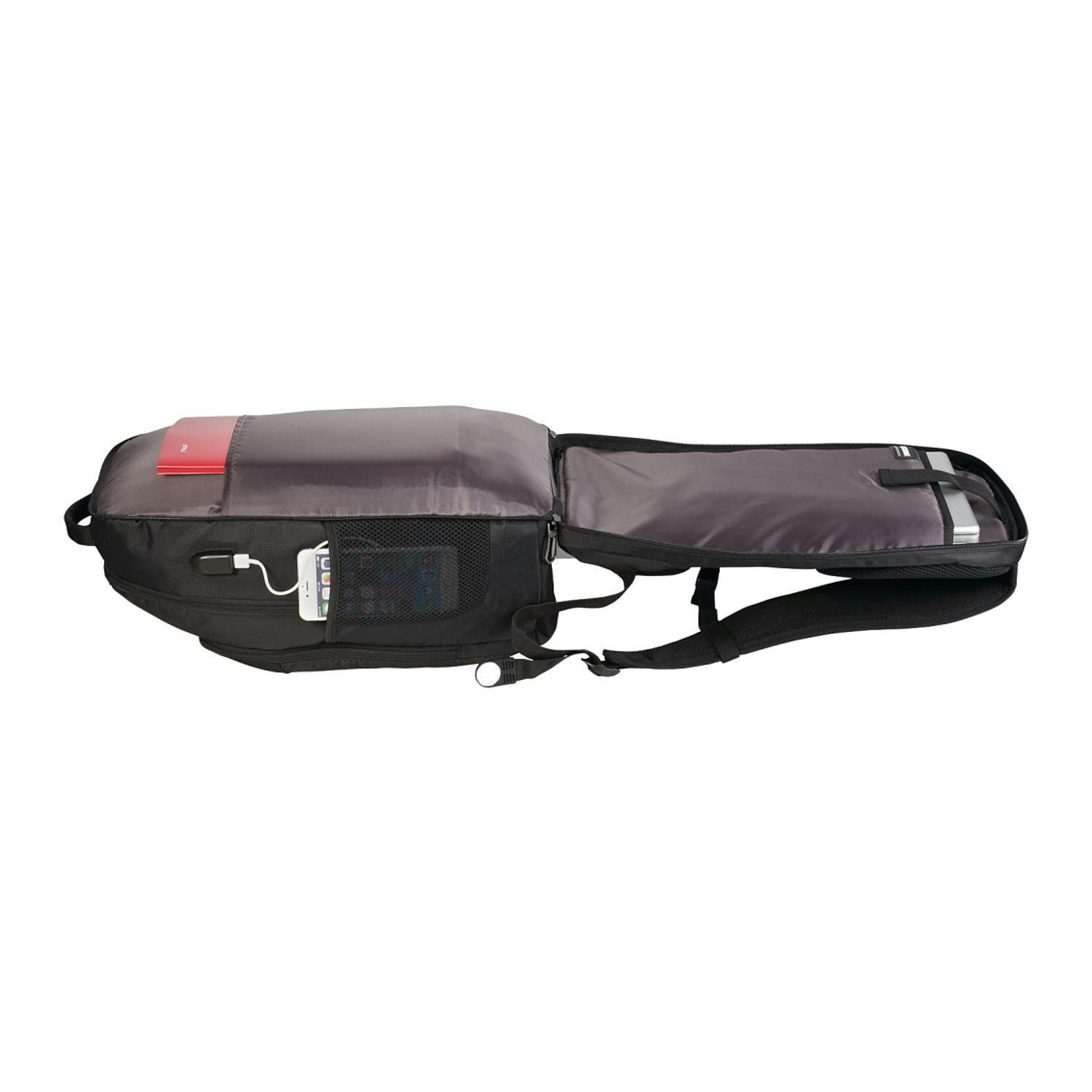 The Foyager TSA 15" Computer Backpack features a large zippered main compartment that offers ample room for all of your tech accessories and tablet. The main compartment has built in USB port and cable which allows for seamless charging capabilities of your tech products inside the backpack. Includes a 15 inch TSA padded computer compartment that unfolds to lay flat on the X-ray belt to increase speed through security. Additional storage on the front panel of the bag includes a deluxe organizational panel and two side mesh water bottle pockets. Custom zipper pullers, padded back panel, chest strap, and trolley sleeve.