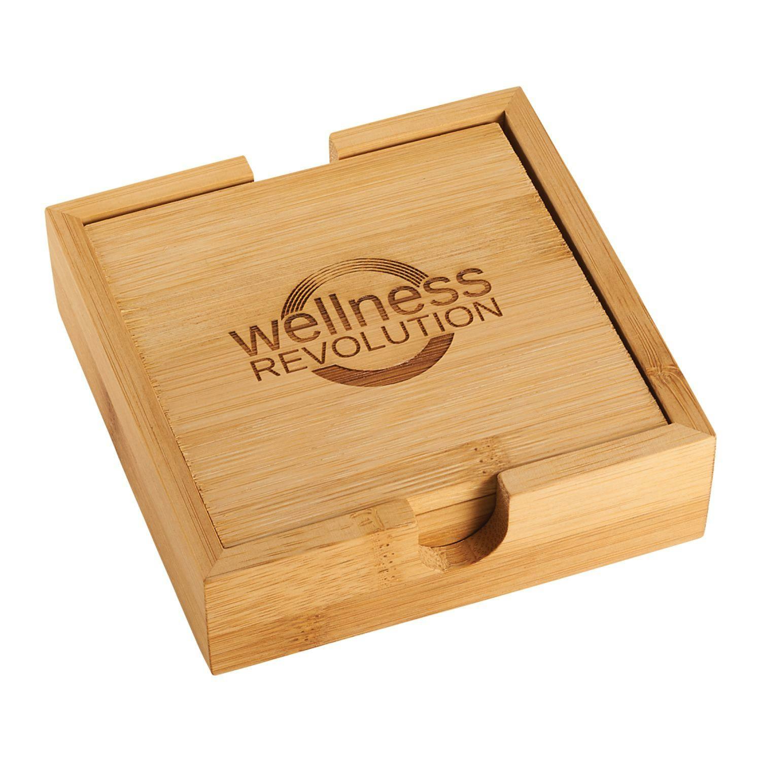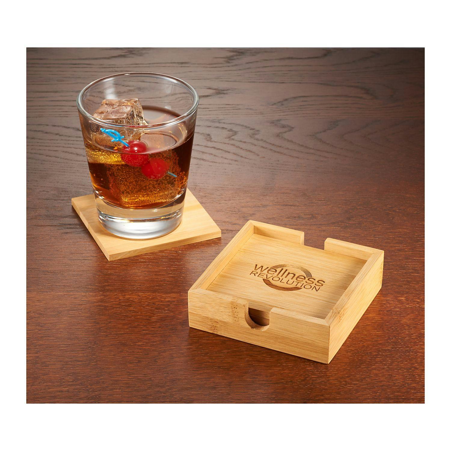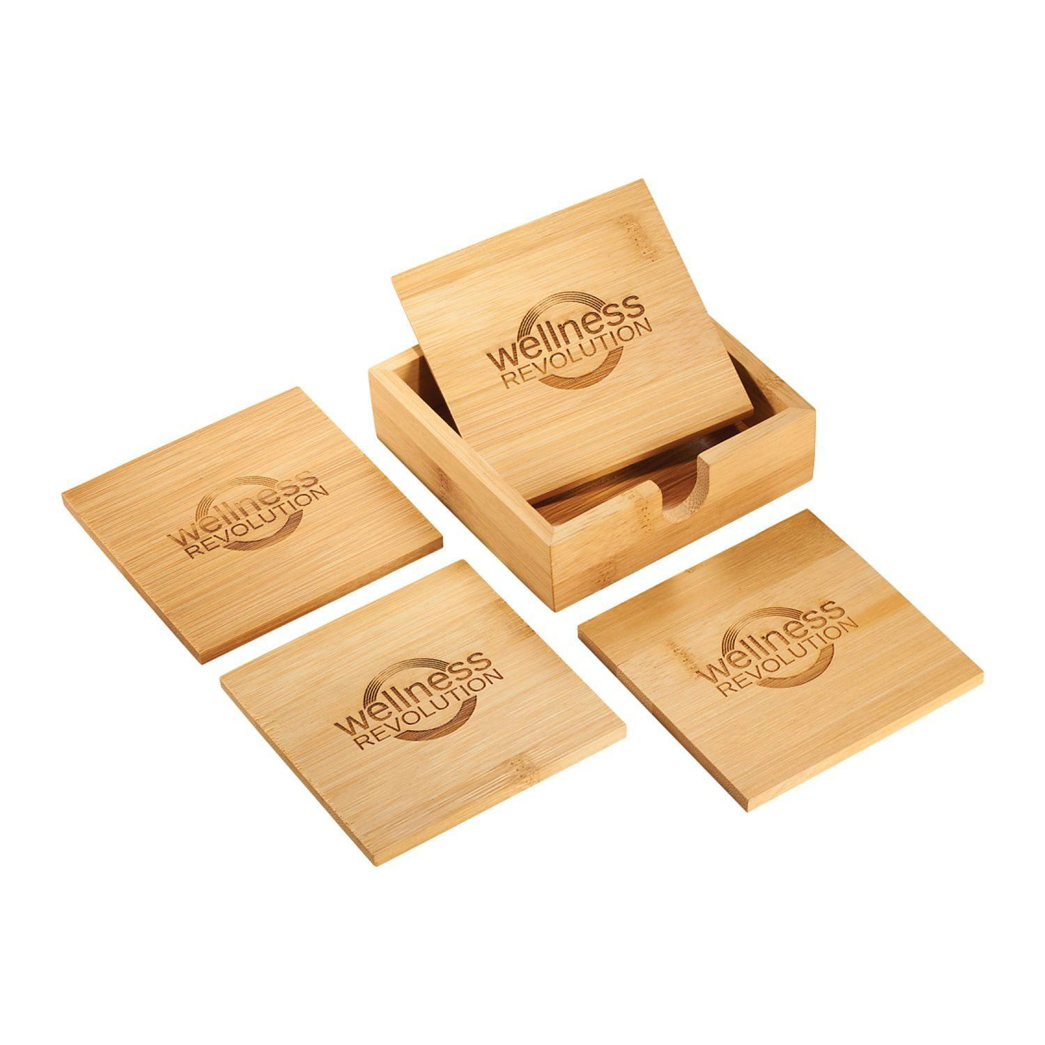 This five piece coaster set includes four bamboo coasters with a bamboo caddy to easily store the coasters. The coasters stack neatly in the caddy and put any logo prominently on display. Decoration on all four coasters. Due to the nature of the bamboo material, variations in laser imprinting quality may occur.