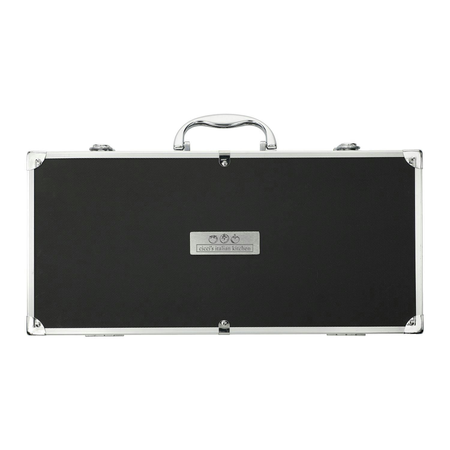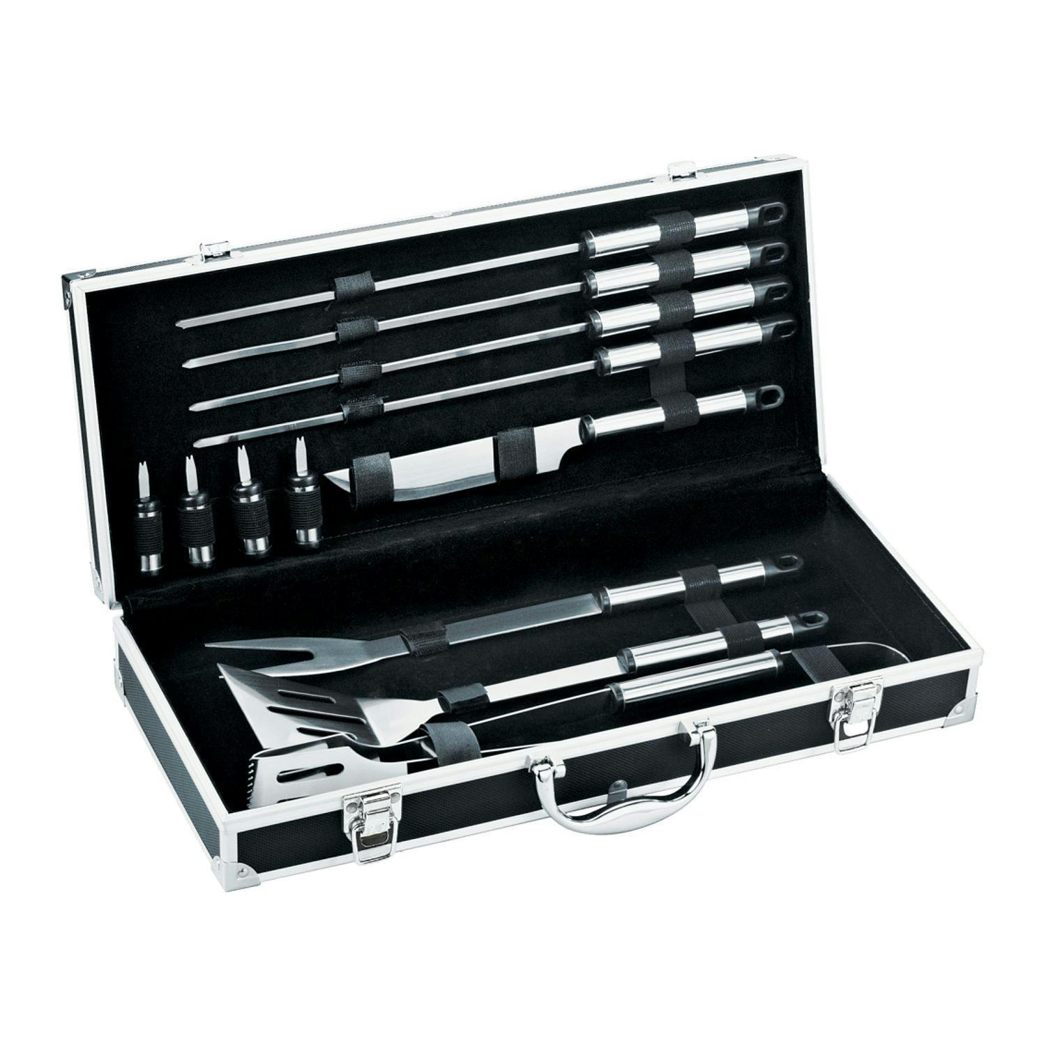 Grill Master Set — 13-piece BBQ set with everything a backyard pitmaster needs: spatula, tongs, carving knife, fork, four skewers and four corn holders, all stashed in a sleek aluminum-accented case. Durable stainless-steel tools with plastic handles and stainless-steel grips reduce heat transfer so you can baste, turn and control charring with confidence. Compact, portable and gift-ready — ideal for backyard barbecues, tailgates, picnics or camping. Note: do not expose handles to direct heat or use in the broiler.