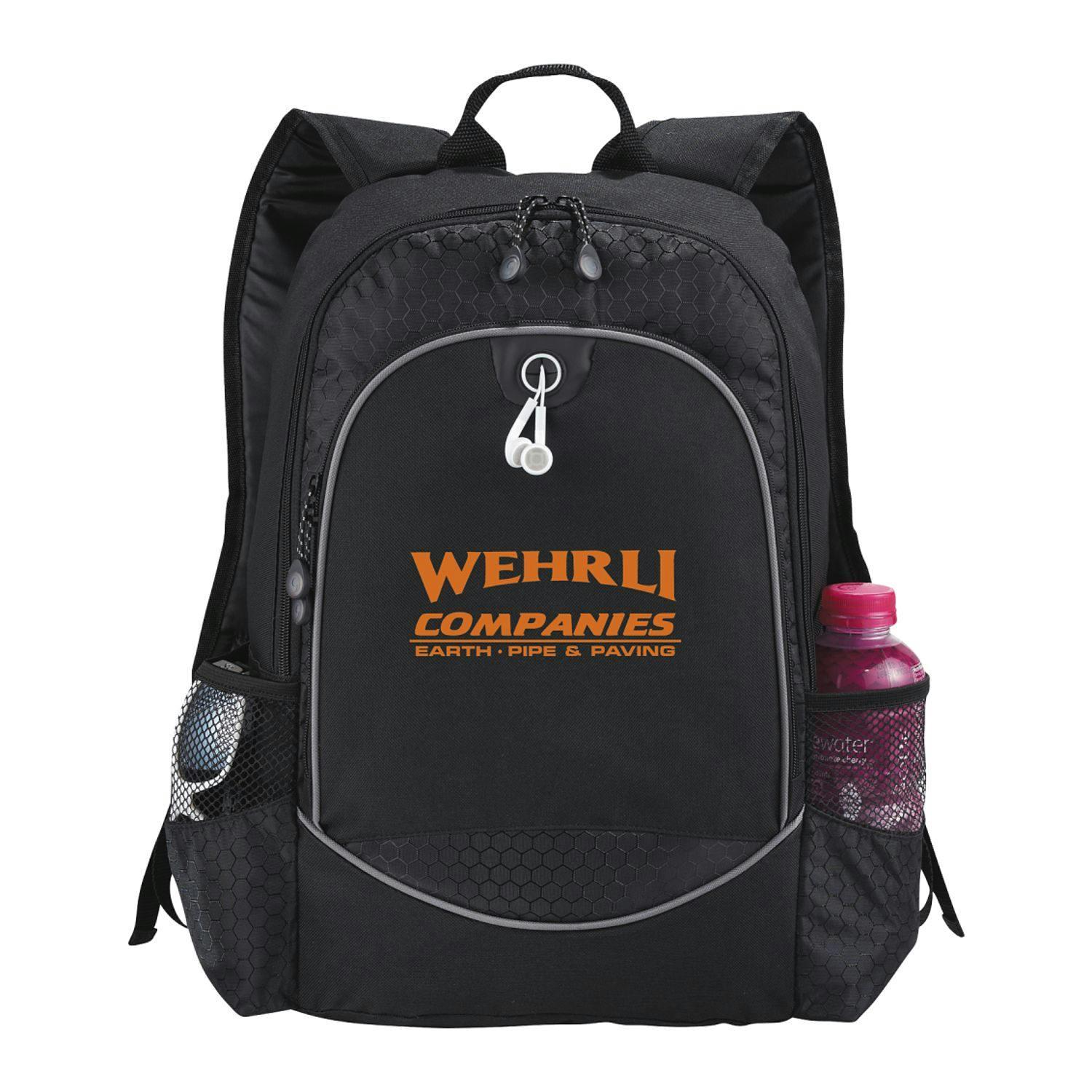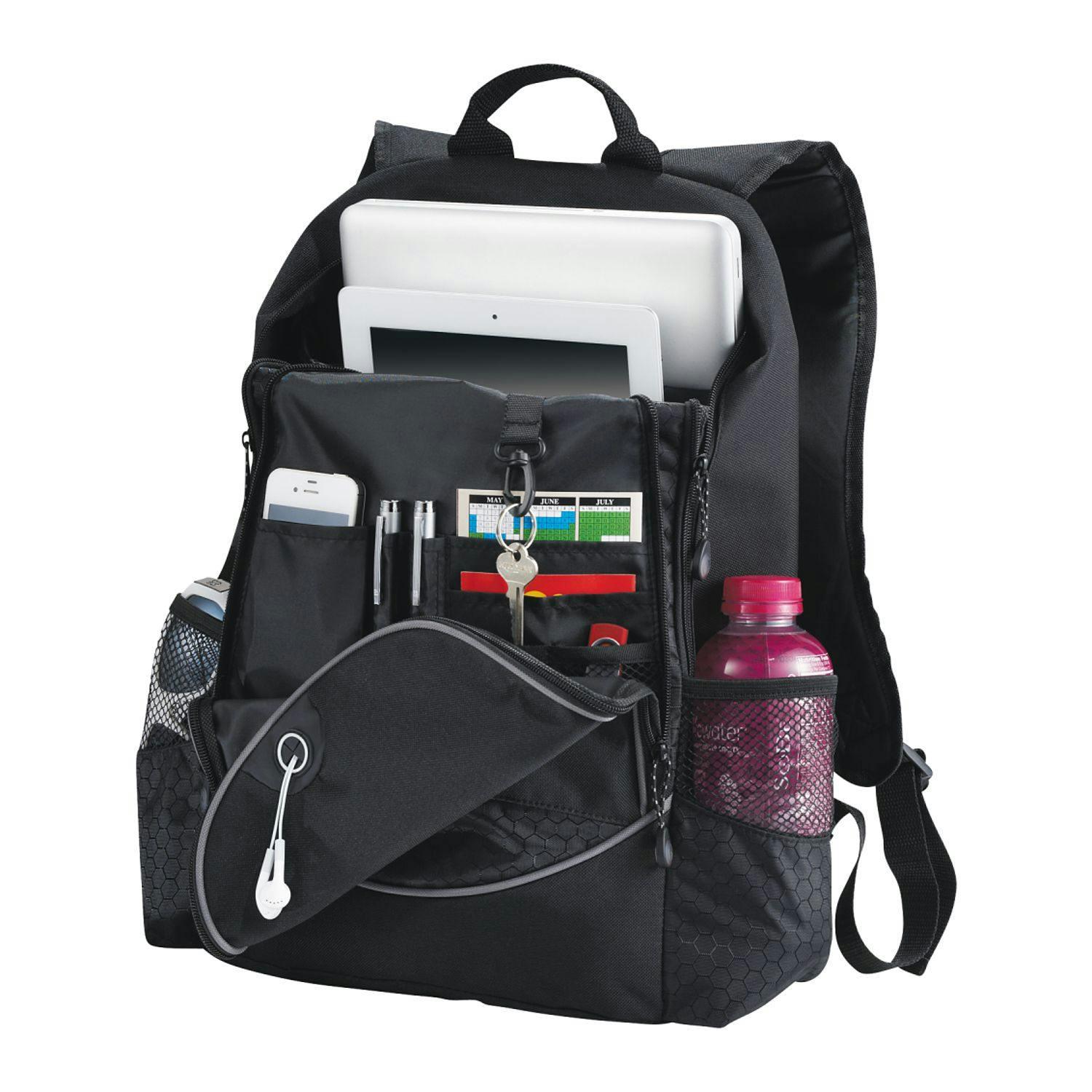 The Hive 15" Computer Backpack features a zippered main compartment that holds your laptop and includes a padded compartment for your iPad® or tablet. Large front zippered pocket has organization and earbud access. Features two side pockets and adjustable backpack straps and carry handle.