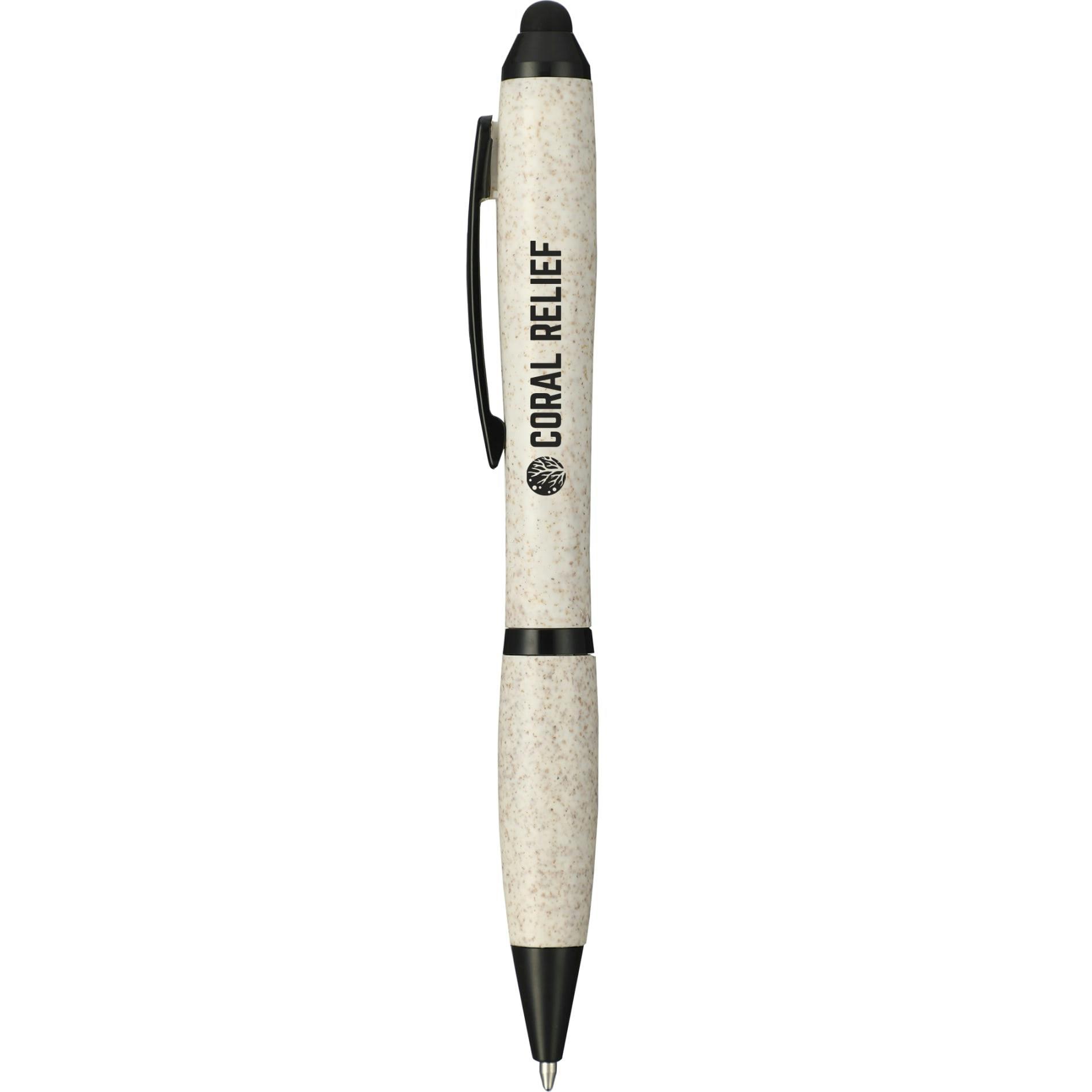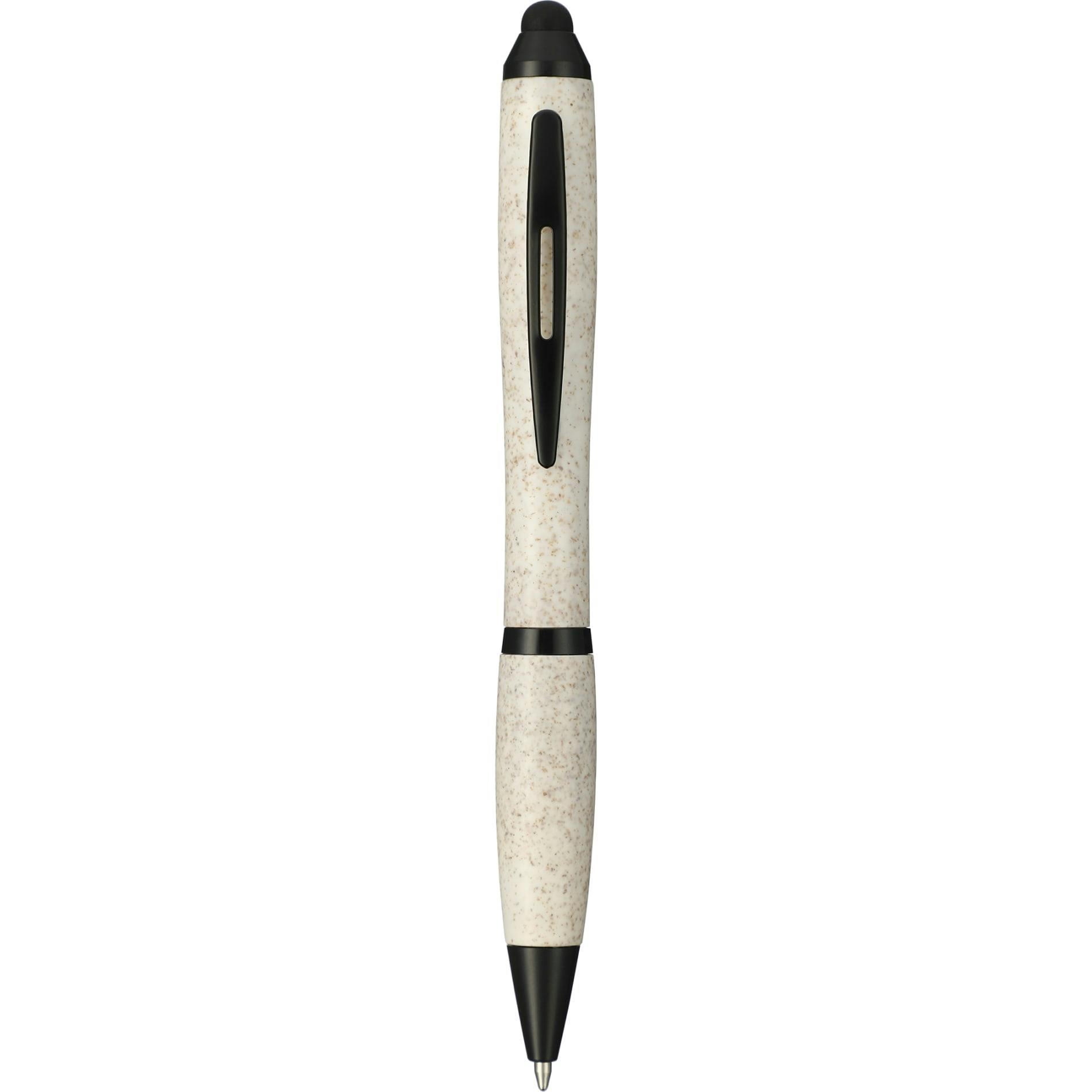 The Nash Wheat Straw Ballpoint Stylus Pen features a 40% wheat straw barrel with black accents. Soft, rubberized touch stylus. Twist action mechanism. Black ink cartridge with 1.0mm pen tip. 800m writing length.