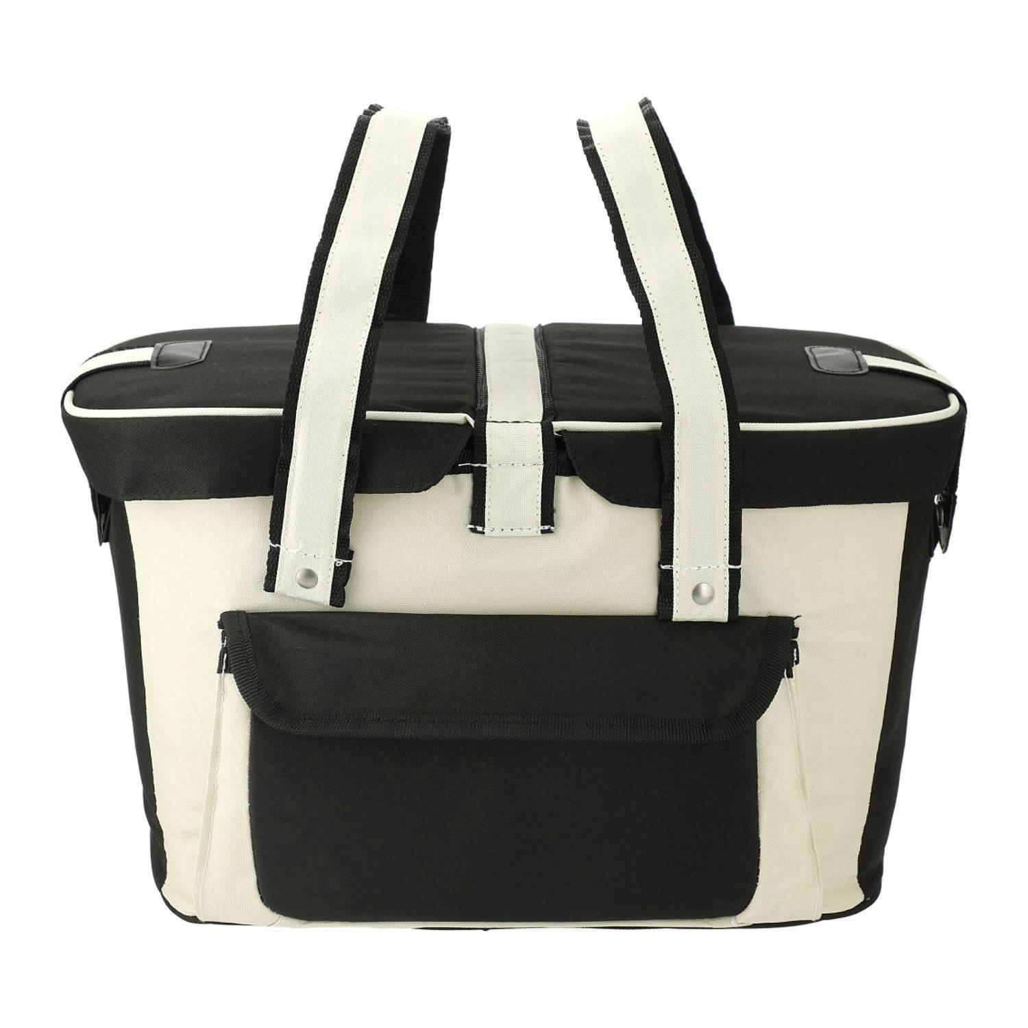 Main compartment features unique picnic basket design with dual snap closures. Holds up to 24 cans. External accessories pockets. 6" handle drop height. Insulated PEVA lining.
