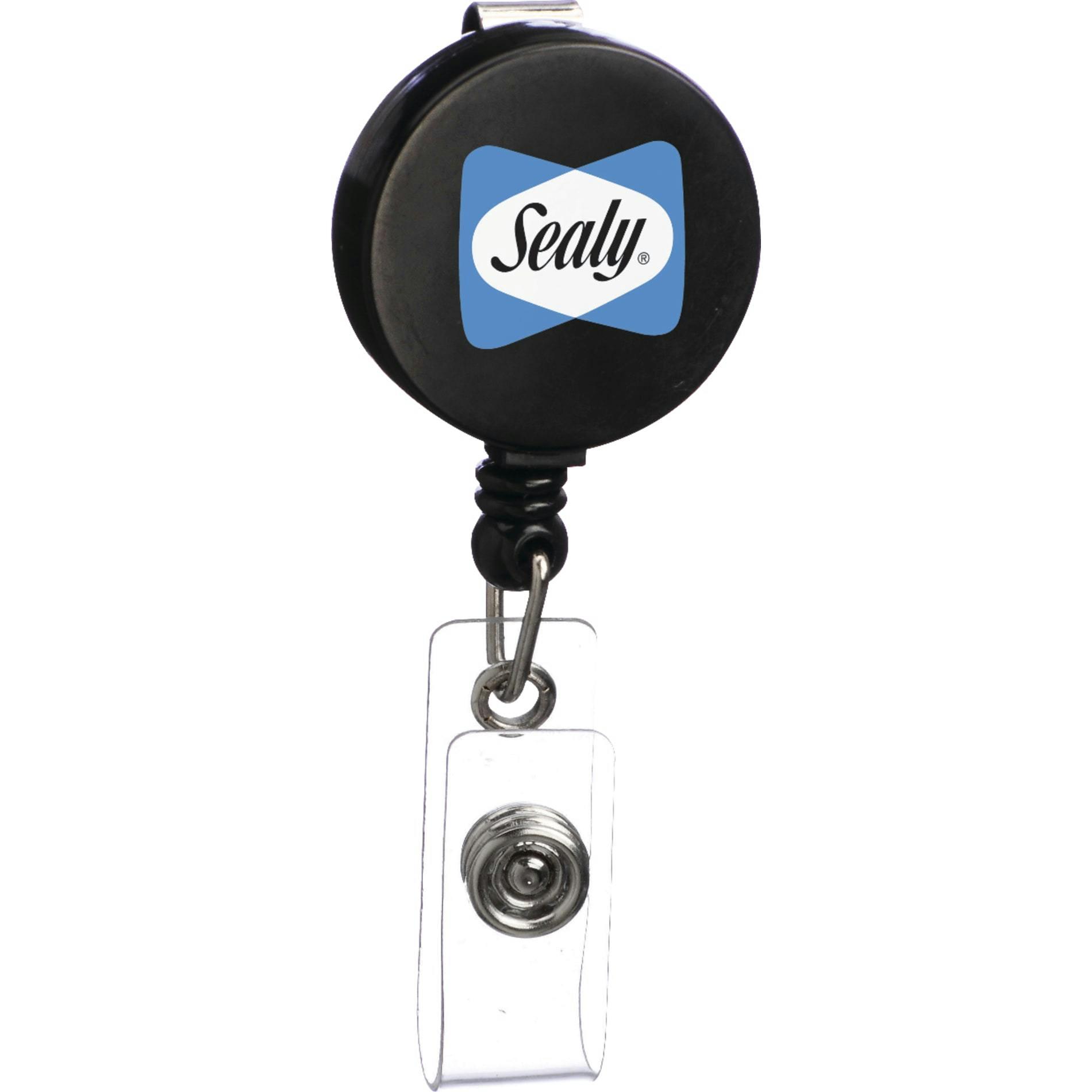 Retracting cord extends 32". Belt clip on back. Great for tradeshows and employee badges. Can also be used as a key ring holder.