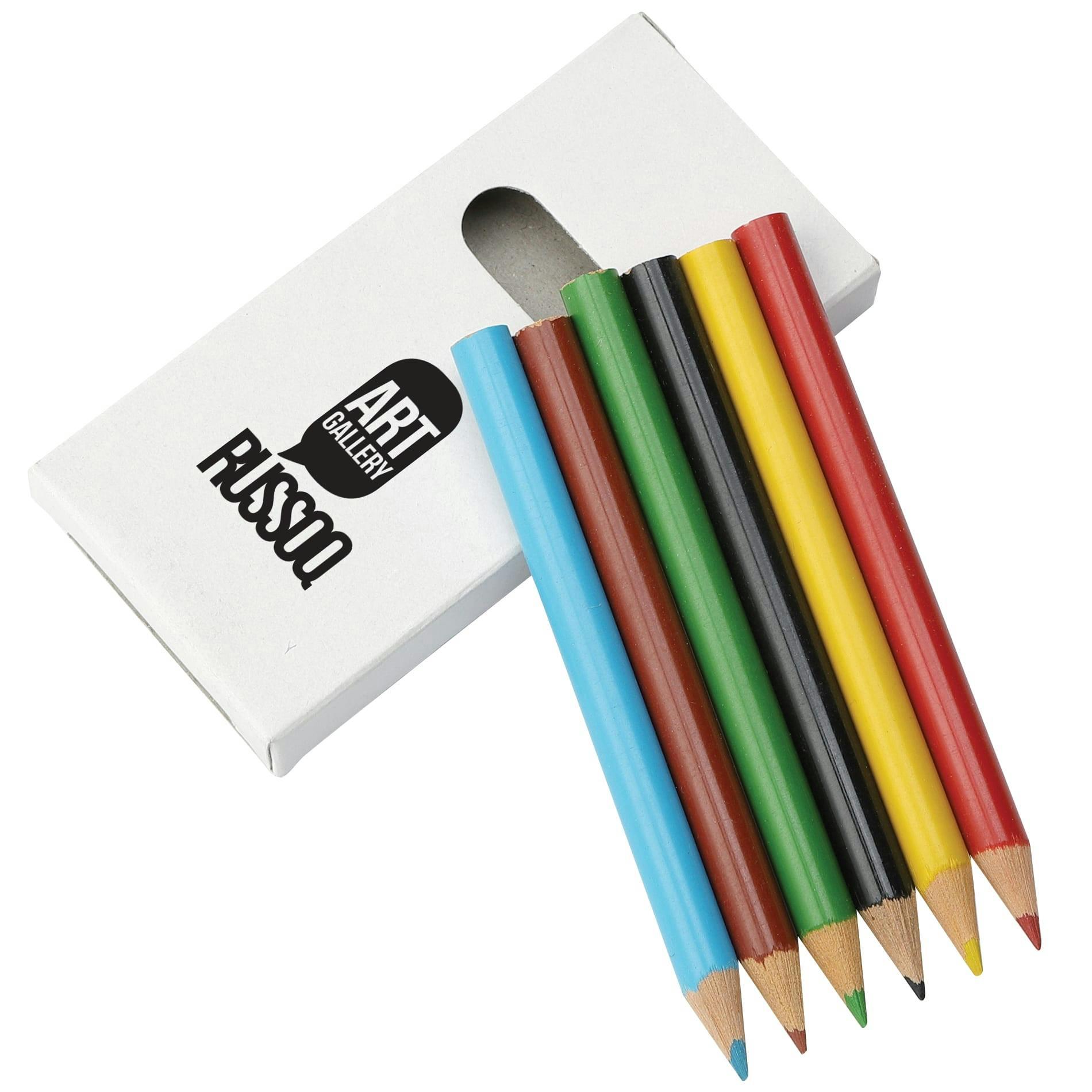 6 colored pencils in a white paper box. Pencil colors include yellow, fuchsia, light blue, lime green, dark brown and black.