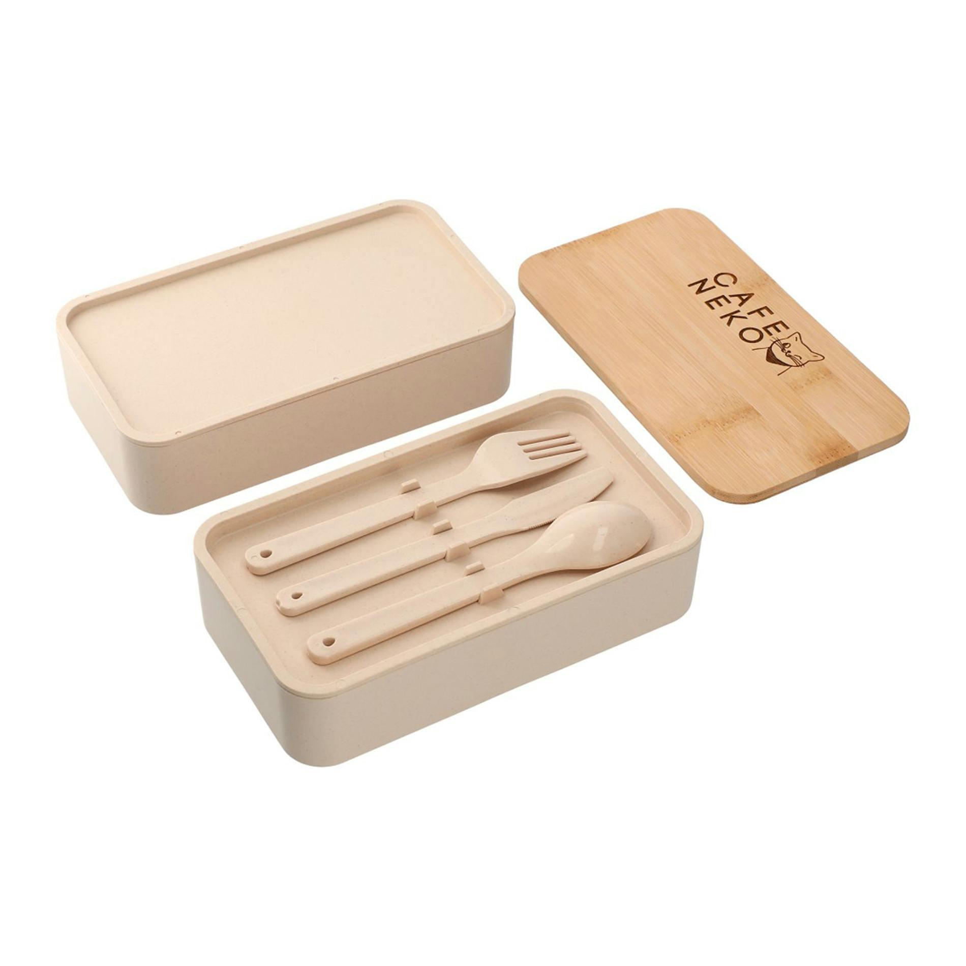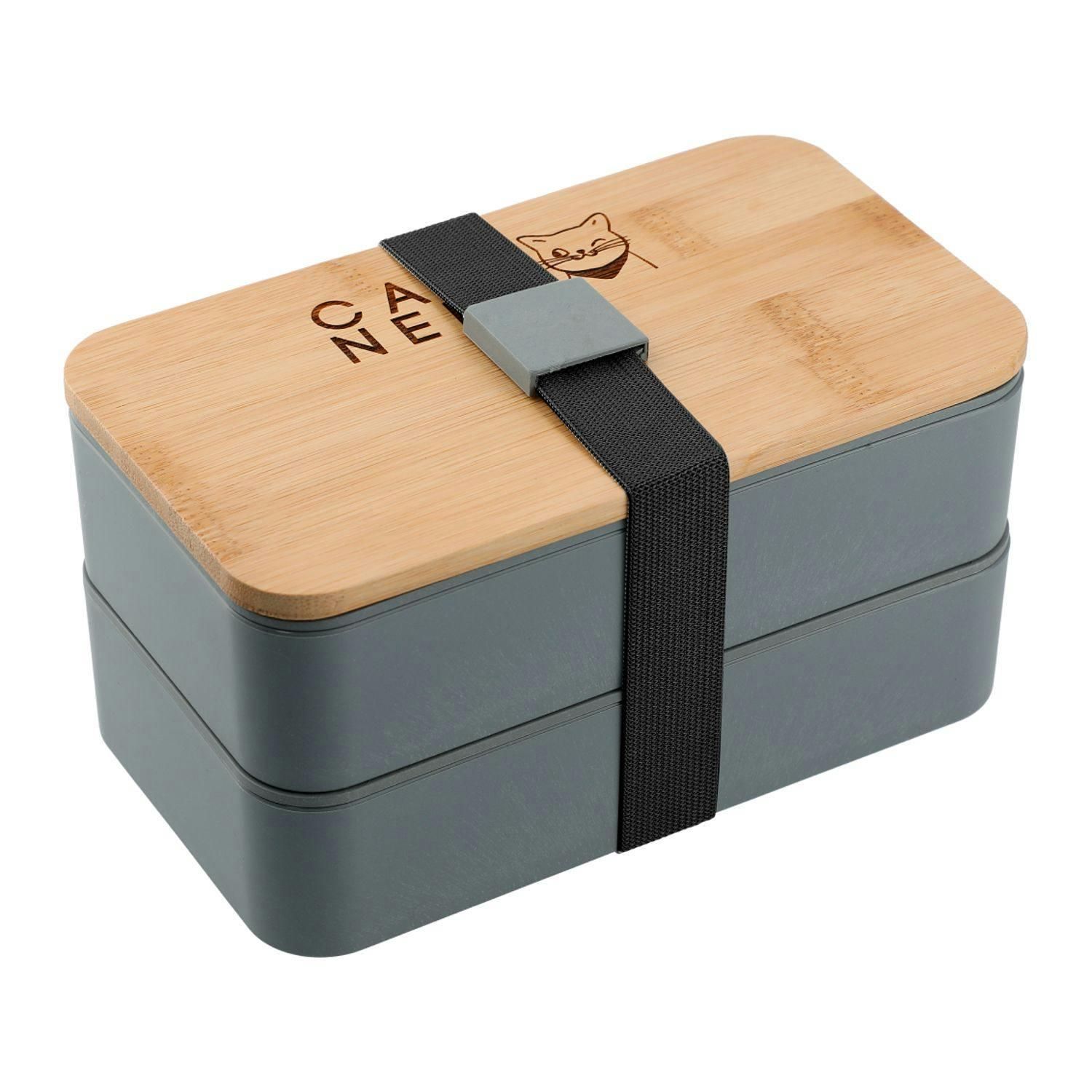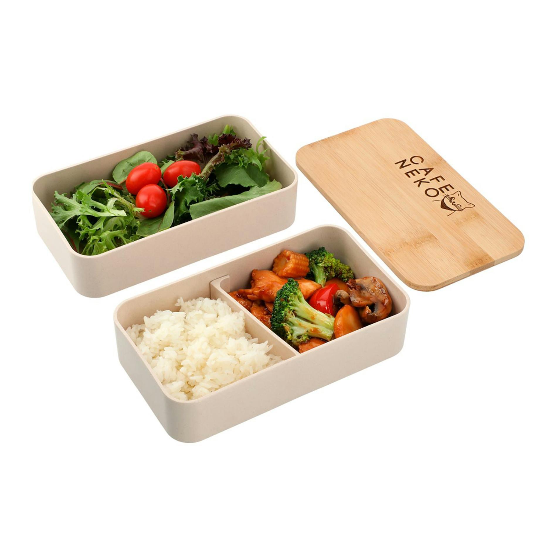 Stackable Bamboo Fiber Bento Box — an eco-friendly, reusable lunch box with two leak-resistant tiers and built-in utensil storage between the layers. Crafted from bamboo fiber with durable polypropylene accents, this stylish bamboo lunch box reduces single-use plastic and is ideal for office lunches, school meals, picnics, and meal prep. Compact and lightweight (4.25" H x 7.37" W x 3.87" D), it arrives in an FSC-certified natural gift box — a sustainable promo or corporate gift option from PCNA.