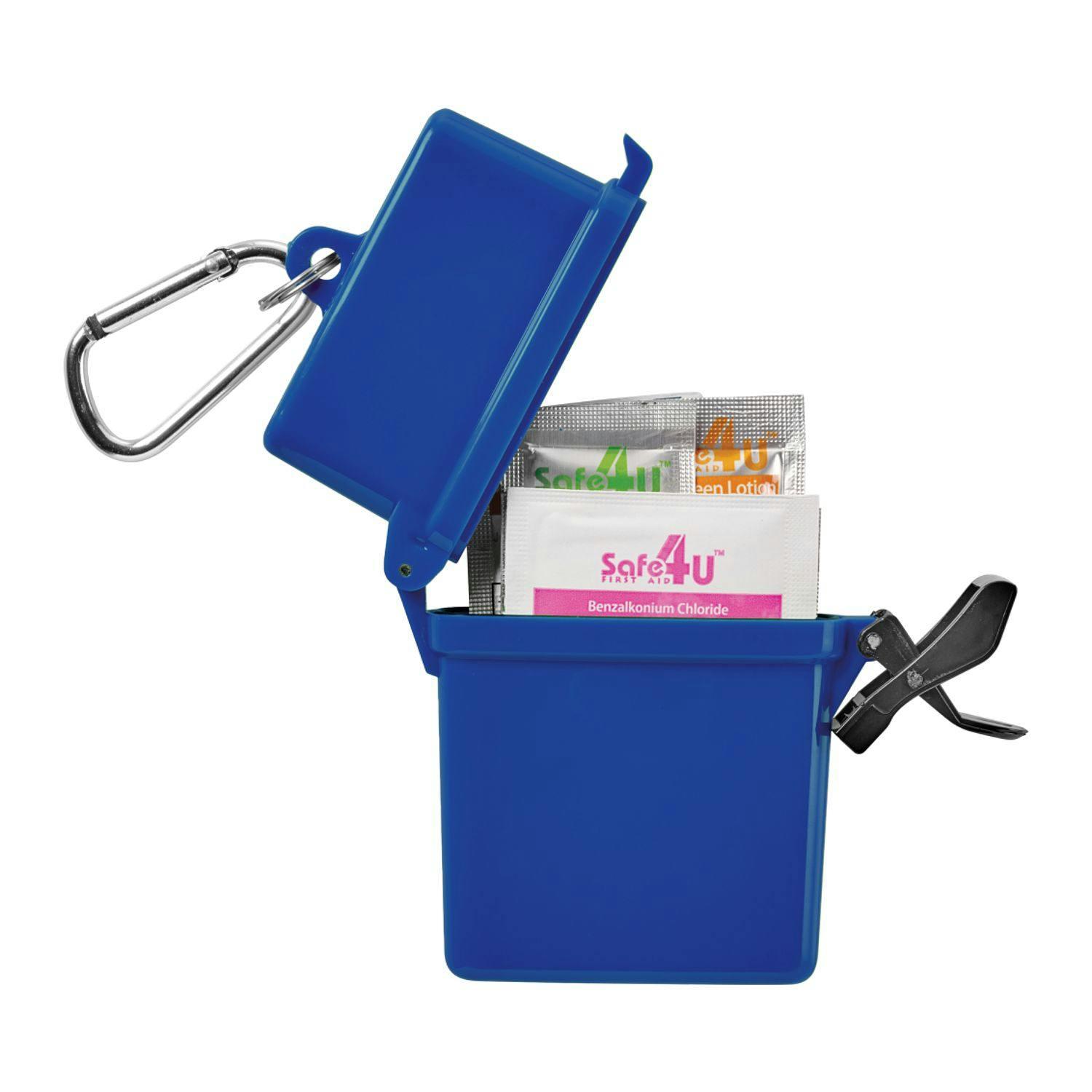 The Trek 8-Piece Waterproof First Aid Kit is a mini first-aid kit in a flip-top waterproof floating container with metal mini-carabiner for convenient first aid care. The kit includes 2 adhesive bandages, 2 antiseptic wipes, 1 Hand Sanitizer packet, (2) SPF30 Sunscreen packets and 1 aloe/after sun care packet. Sunscreen does not contain Octinoxate or Oxybenzone. Meets FDA requirements and is available for shipment within the United States (including Alaska, Hawaii & Puerto Rico). Not available for export. See General Information page for additional air shipment charges. Not available in Canada.