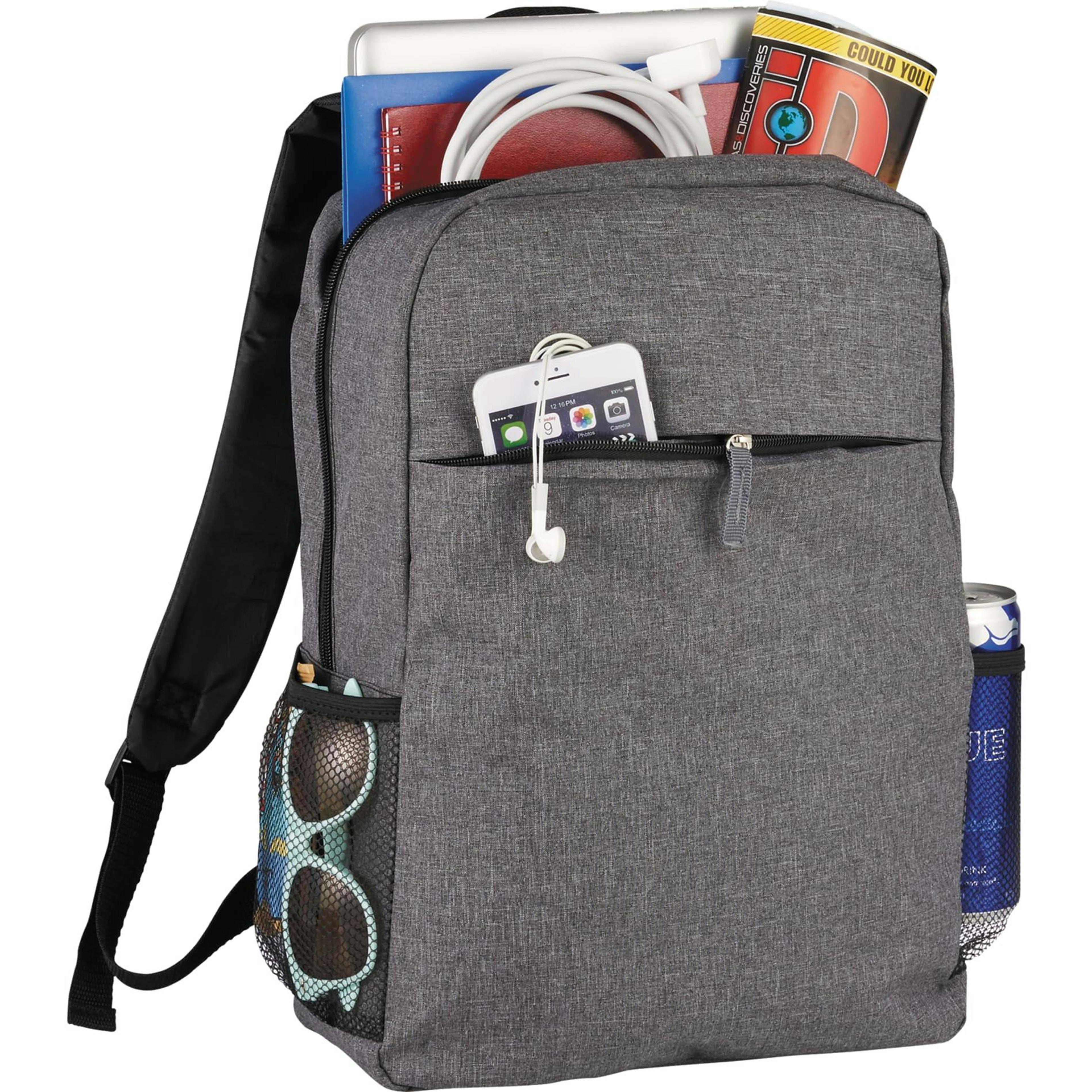 The Urban 15" Computer Backpack features a zippered main compartment and can hold up to a 15 inch laptop. Its zippered front pocket allows for additional storage for a phone, tech accessories, and your everyday essentials. Also includes a mesh water bottle pocket and adjustable, padded shoulder straps with a top grab handle. Disclaimer: There may be minor variations in color of the actual product due to the nature of the fabric dyes, weaves, and printing.