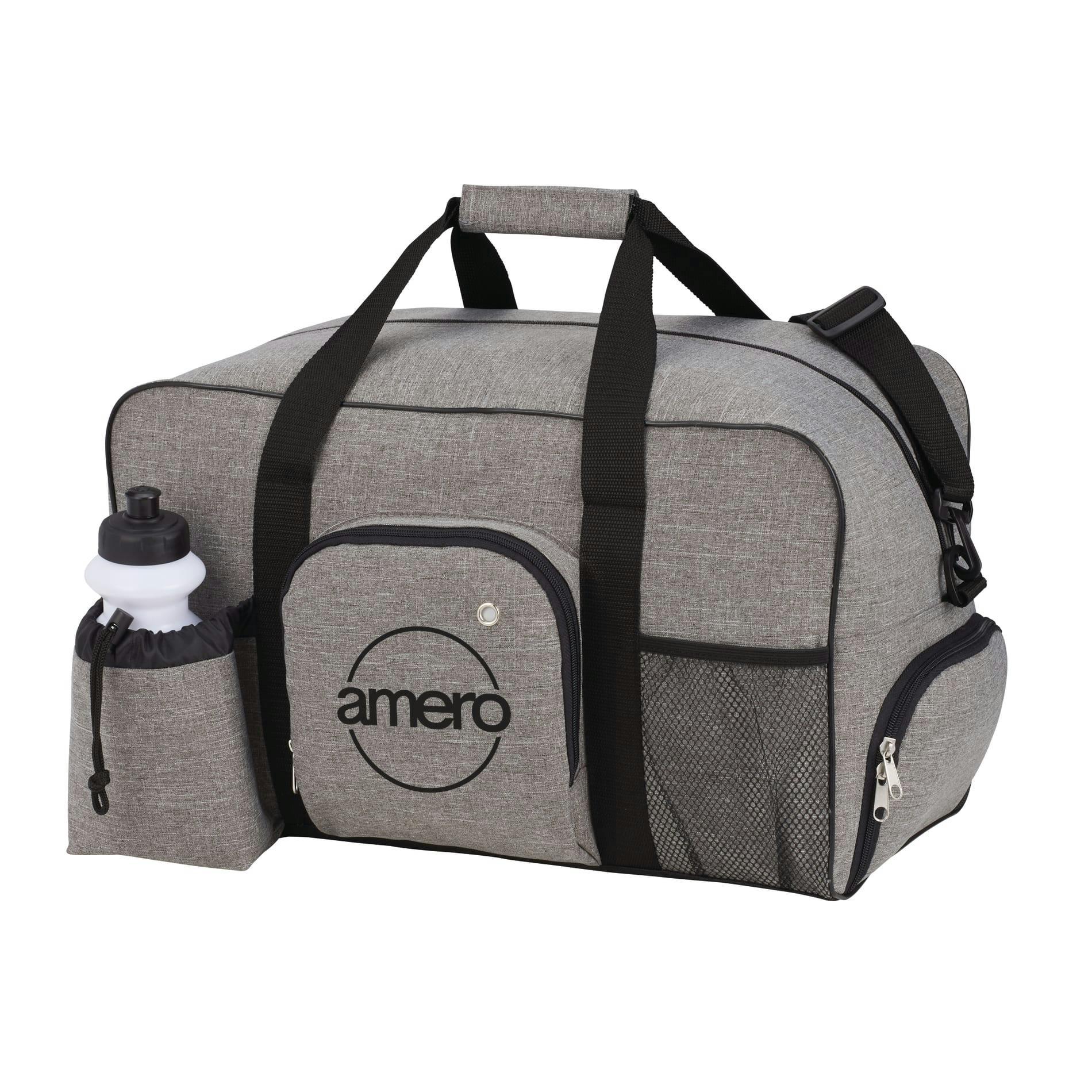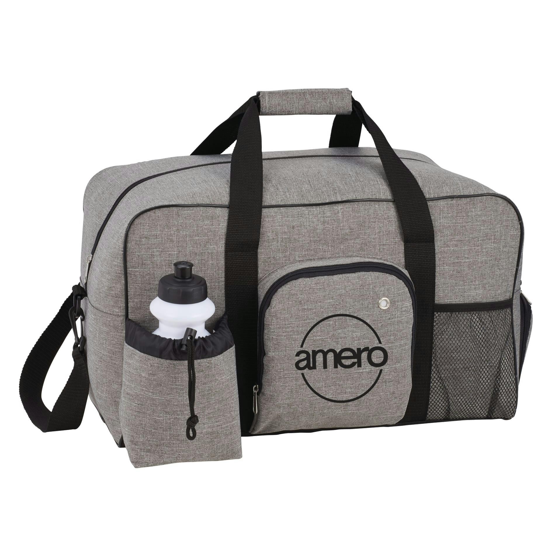 Travel-ready and built to last, the Weekender 18.5" Deluxe Duffel Bag pairs rugged 600D PolyCanvas with a roomy zippered main compartment and smart organization for weekend trips, gym sessions, or promotional giveaways. Access your device and tunes via the zippered media pocket with earbud port, separate shoes in the zippered side compartment, and keep gear stable on the secure bottom board. A front mesh pocket, drawstring pouch with included squeeze-top water bottle (not imprinted), reinforced 20.5" handles and an adjustable, detachable shoulder strap make carrying effortless. Measures 18.5" W x 11" H x 10.25" D, 2.09 lb; available in multiple colors.