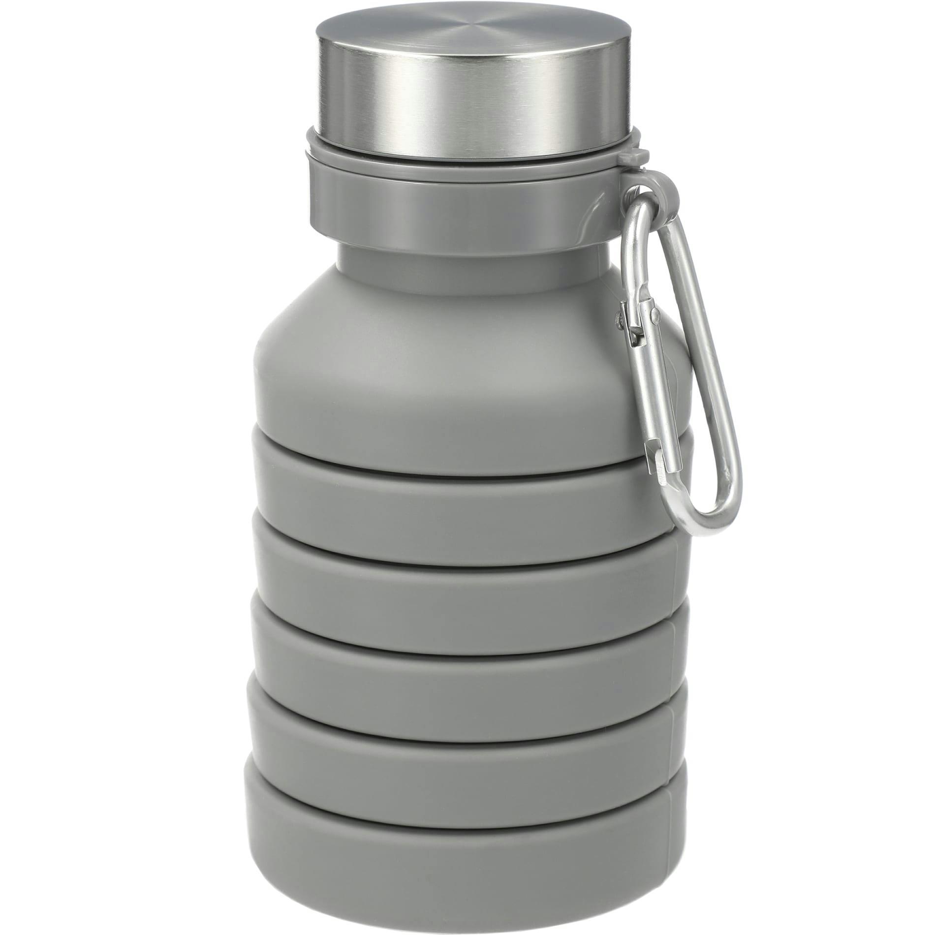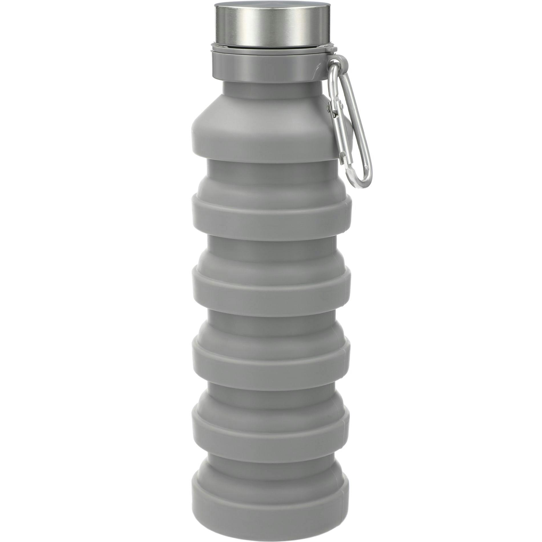 The Zigoo Water Bottle features a collapsible and lightweight design which helps you save 50% space. It's portable and easy to store. It reserves 18oz liquid with only 198g in weight and it can collapse from 9.2inch to 5.45 inch in height. Water bottle is made from food grade silicone including a stainless steel lid with carabiner attached. It is leakproof and is great for all types of activities and sports. Only the bottle (not the lid) is dishwasher safe for easy cleaning and is designed with a wide mouth opening for filling ice cubes. Includes matching carabiner. BPA Free. 18oz. Laser engraving silver Drinkware will result in a subtle, tone on tone decoration “The placement of the carabiner will vary in relation to the imprint on the lid”.