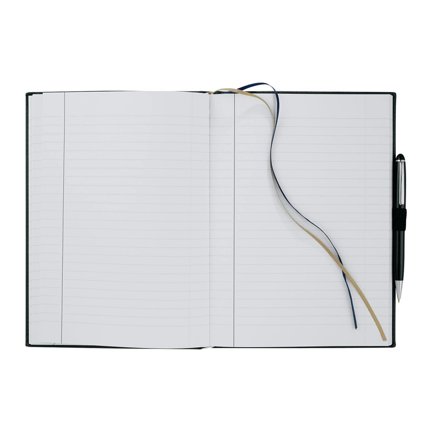 Hard cover, bound journal. Elastic pen loop. Blue and silver ribbon page markers. Includes 125 sheets of white lined paper. Pen is not included.