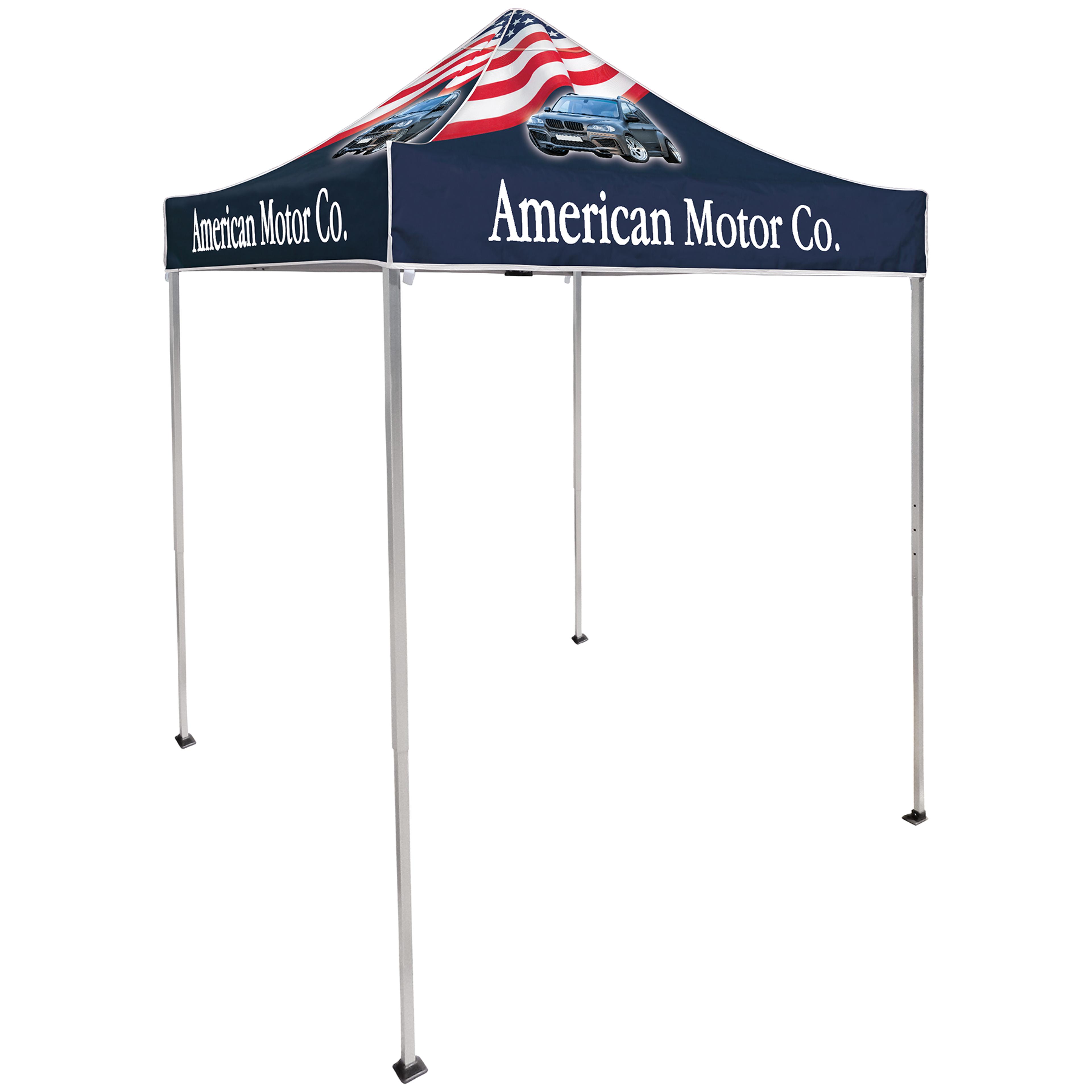 Why is this 6.5' Square Canopy Tent special from Quinn? Simply because, it offers bright, highly detailed printing on all valances and peaks with no additional or set-up charges! Made from heavy 600 denier polyester material, this tent is perfect for trade shows, tailgating, festivals, fairs, fundraising events and more. Includes an easy and versatile aluminum pole frame, canopy, ground spikes and carry bag. Tent kits with wall options are available. Weights to anchor frame are available. Shipping quoted upon request.