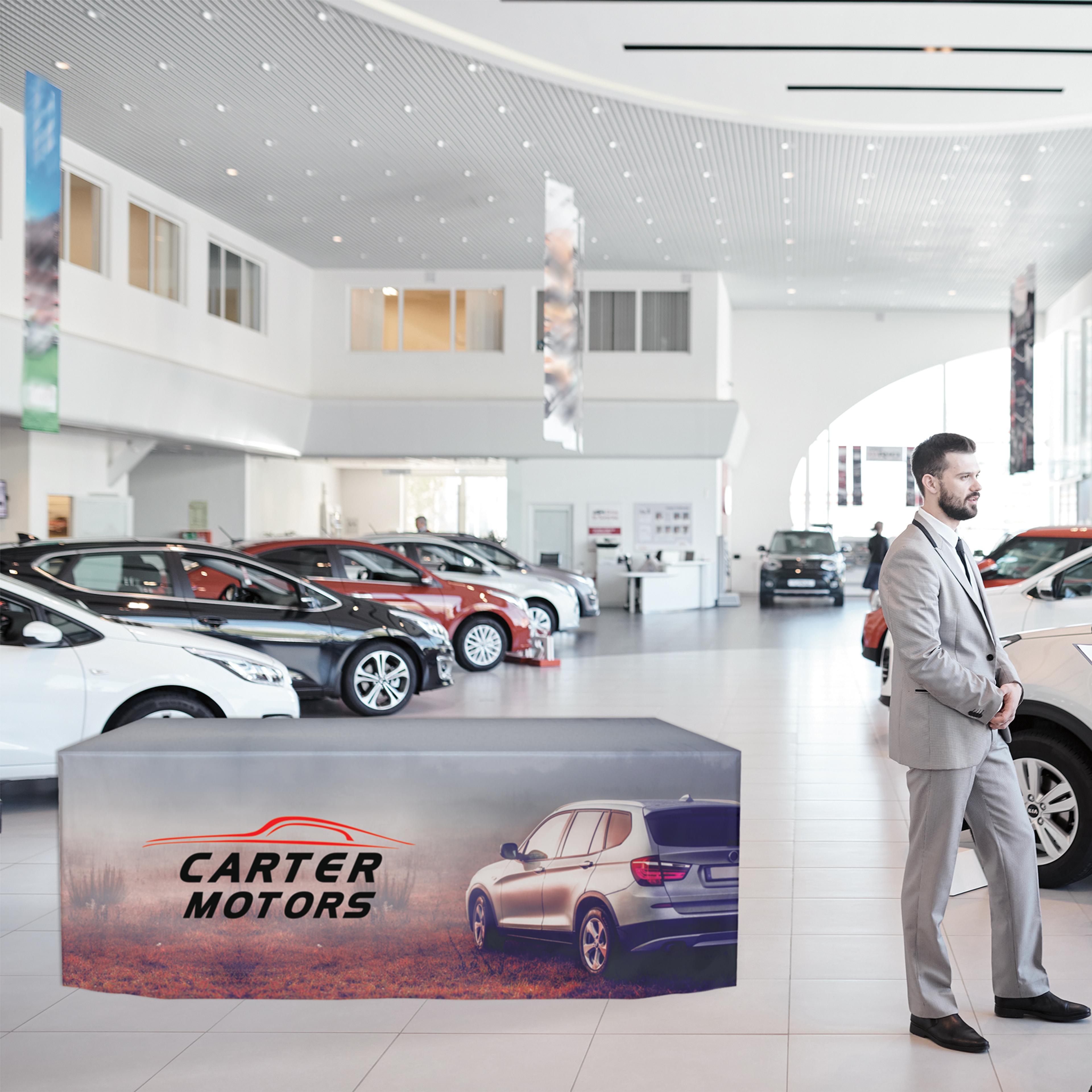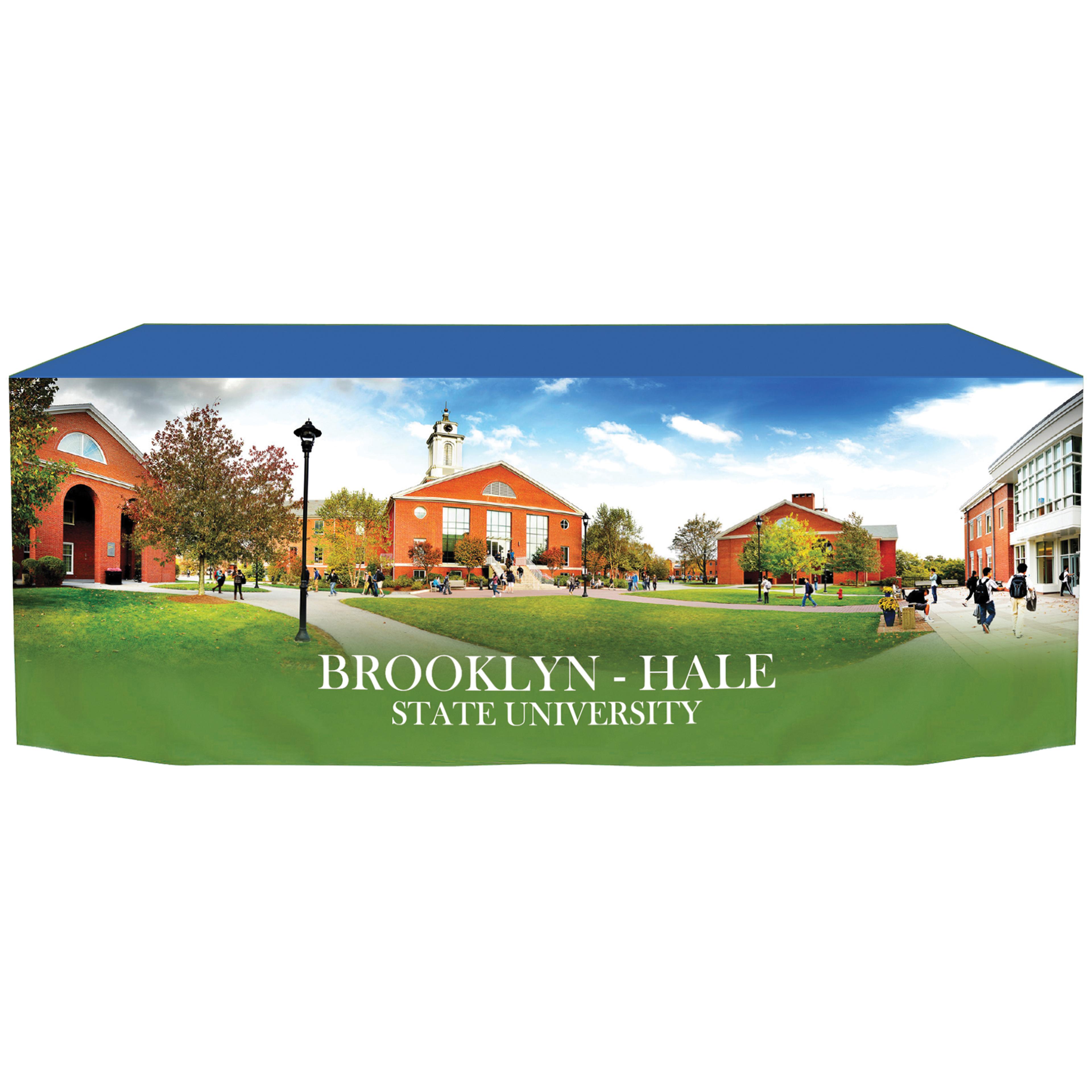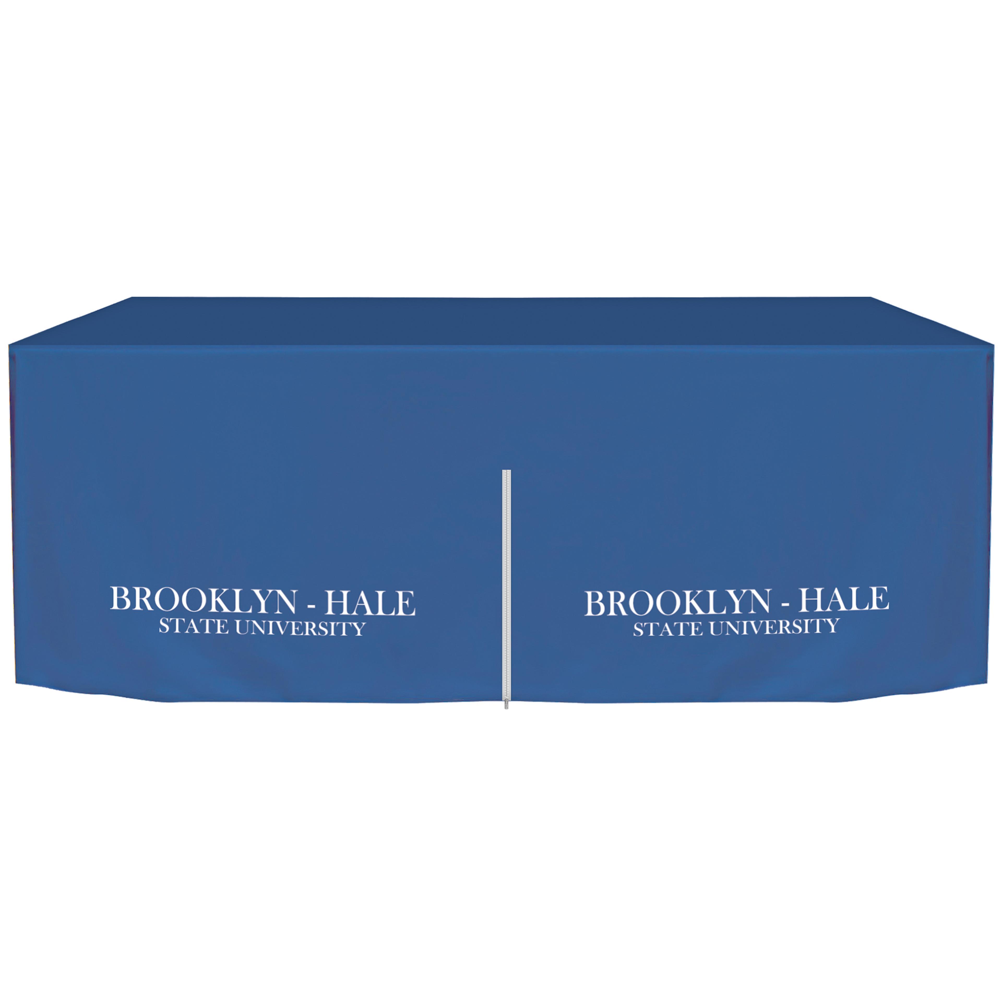 Tidy up your designated space with the 6' customized zipper back fitted table cover! With this fully customized fitted table cover, demand attention and draw crowds to your table at conventions, conferences, and trade shows. We start with 6' of white display polyester material to which you can add your background color from our PMS color chart. Your chosen background, logo, and design can be digitally printed on the cloth. The zipper is either black or white, please specify if a certain color is desired. It's designed for a standard 6' table. Fits 6' tables (72" length, 30" width, 29" height).