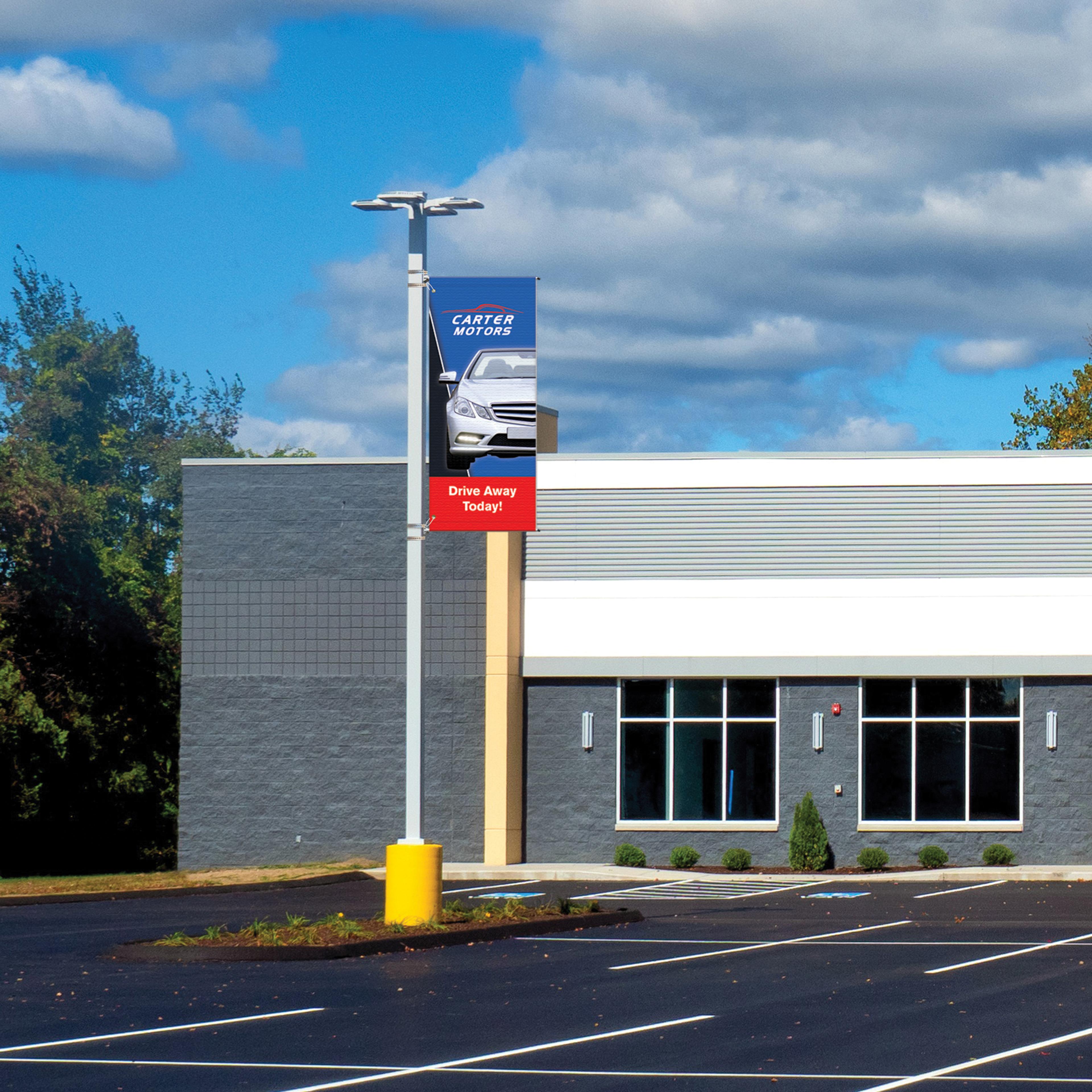 Make a bold statement outdoors with the 72" x 30" Custom Avenue Banner, designed to boost visibility along streets, campuses, and event spaces. Made from heavy-duty 28 oz. opaque vinyl, this double-sided banner features vibrant, full-color PMS-matched graphics on both sides for maximum exposure from every angle. Built to withstand outdoor conditions, it’s ideal for promoting events, organizations, businesses, or school pride. Finished with 3" sewn pole sleeves at the top and bottom and reinforced grommets, this custom street banner installs easily and delivers long-lasting, professional impact.