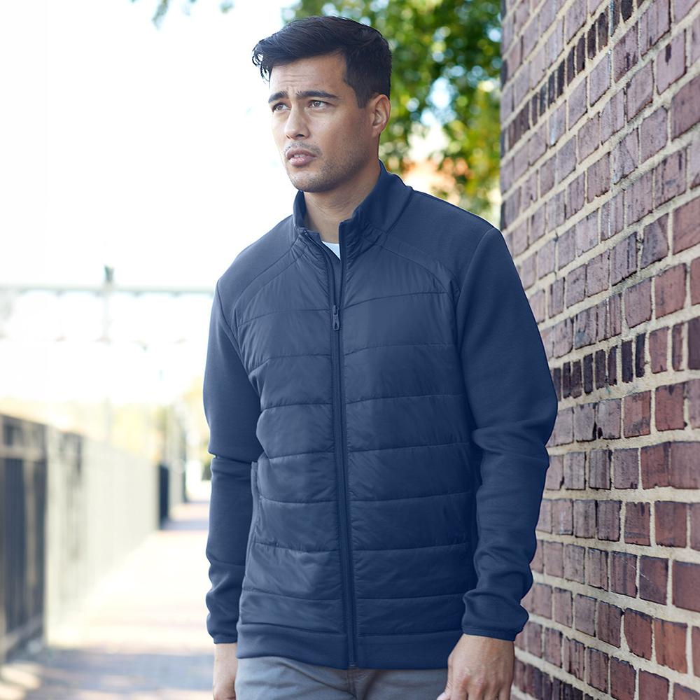 The Spyder Impact Full-Zip Jacket blends performance and sustainability with its stretch knit fabric made of polyester, rayon, and spandex, along with quilted nylon and recycled polyester fill for insulation. It features a sleek low-profile mock-neck, center front coil zipper with an internal draft flap, and strategically placed stretch panels for enhanced mobility. The jacket's stylized seams, secure zip hand pockets with phone and coin sleeves, and external side drop-in pockets offer both functionality and style. Reflective Spyder branding and elastic cuff binding add to its modern design, while the jacket is Global Recycled Standard Certified for eco-consciousness. Simply add your design or logo and it's yours!