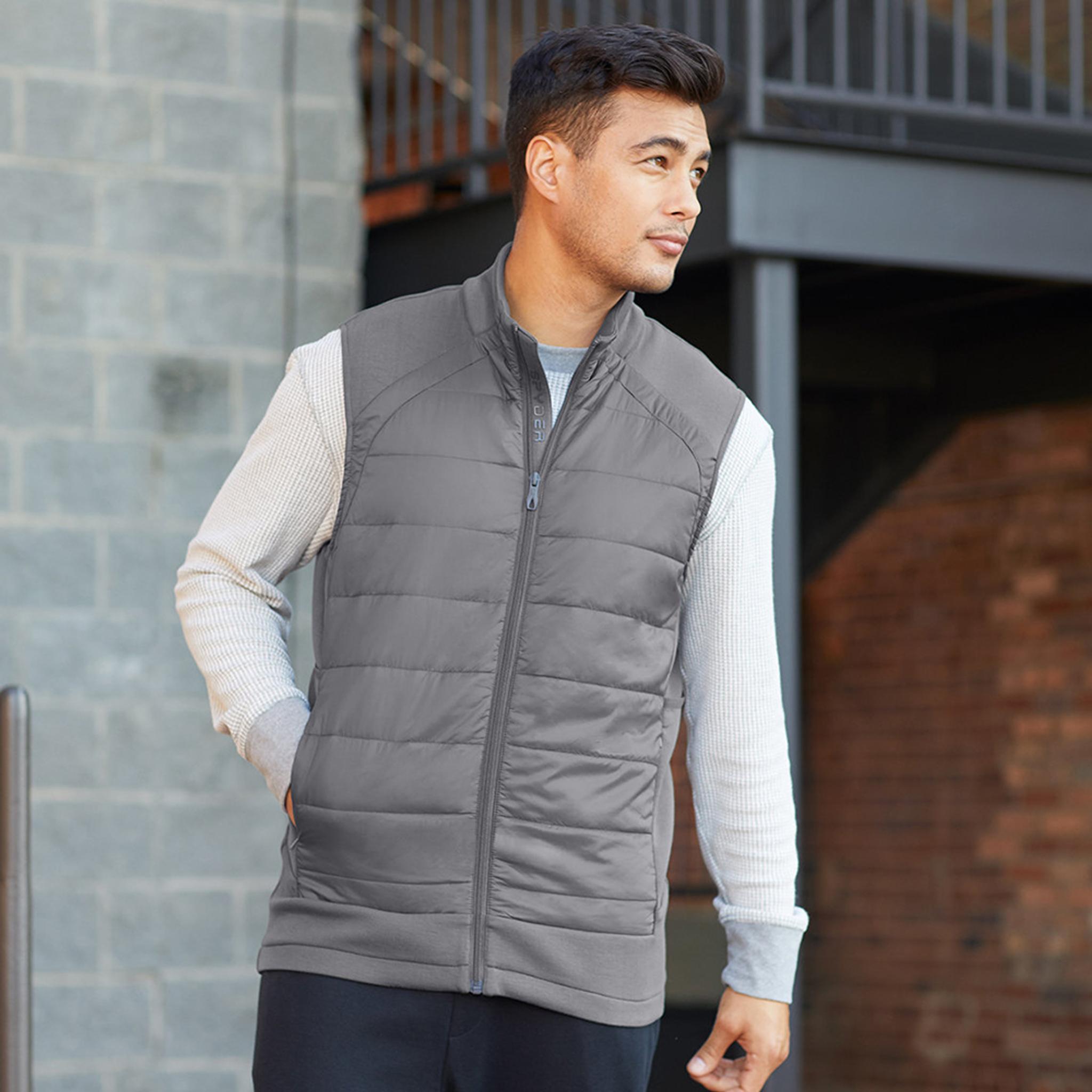 The Spyder Impact Vest features a blend of stretch knit polyester, rayon, and spandex, along with quilted nylon filled with recycled polyester for warmth. Its sleek, low-profile mock-neck and center front coil zipper with an internal draft flap provide a streamlined look. Strategically placed stretch panels offer enhanced mobility, while stylized front and back seams add a modern touch. This vest includes secure zip hand pockets with phone and coin sleeves, external side drop-in pockets, and a reflective Bug logo at the back neck. Global Recycled Standard Certified, it combines sustainability with performance. Create your very own by adding your artwork or logo!