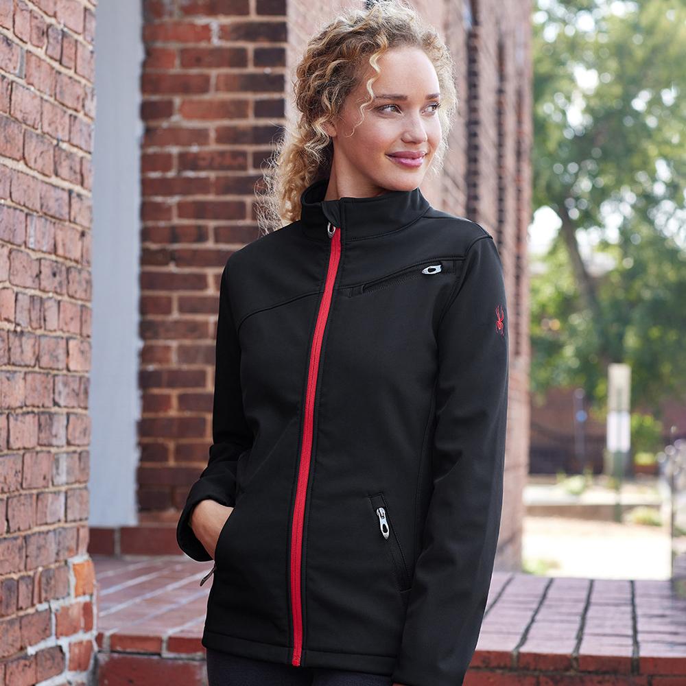 Spyder Women's Transport Soft Shell Jacket — a sleek, customizable outer layer built for comfort and performance. Crafted from a flexible 94% polyester / 6% spandex softshell with a 3-layer X T.L laminate for long-lasting wear, it features micro-brushed tricot at the chin and inner trim for next-to-skin softness. Functional details include a reverse coil center front zipper, zippered handwarmer pockets and a secure zip chest pocket. Asymmetrical seam accents and a modern fit deliver a polished, athletic look—ideal for corporate apparel, team outerwear, event giveaways or everyday commuting. Add your logo or artwork to create branded, professional-looking promotional outerwear.