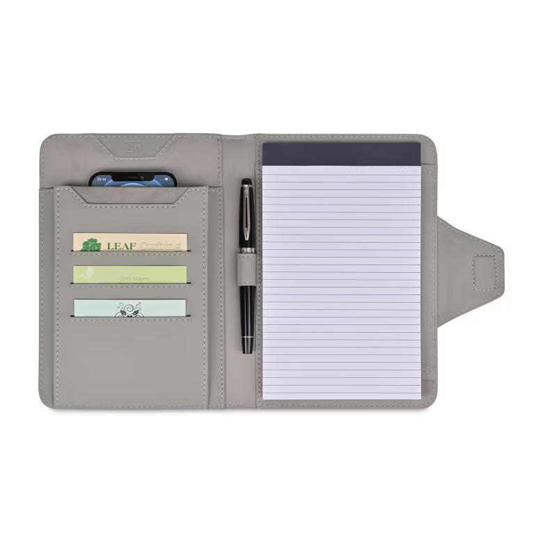 Take your notes anywhere in style with the Travis & Wells® Envoy Junior Magnetic Padfolio, a compact essential built for polished productivity. Crafted from soft top-grain leather, it delivers a refined look that’s perfect for meetings, travel, interviews, and everyday organization. The secure magnetic closure keeps contents protected, while a premium 5" x 8" ruled notepad, suede-lined tech pocket, interior card slots, and a leather-covered pen loop ensure everything stays neatly organized. PVC-free and presented in a premium branded gift box, this padfolio makes a thoughtful executive accessory or elevated corporate gift.