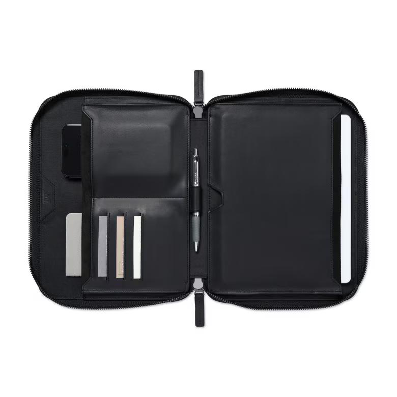 Keep your tech essentials polished and protected with the Travis & Wells® Envoy Junior Tech Folio, designed for modern professionals on the move. Crafted from soft top-grain leather, this sleek folio delivers a refined look that’s perfect for meetings, travel, and everyday work. A secure gunmetal zipper closure keeps everything in place, while suede-lined pockets protect your phone and tablet (up to 10"). Thoughtful organization—including interior card slots, a front slash pocket, and a leather-covered pen loop—ensures quick access to what you need. PVC-free and presented in a premium branded gift box, it’s an ideal choice for executive use or elevated corporate gifting.