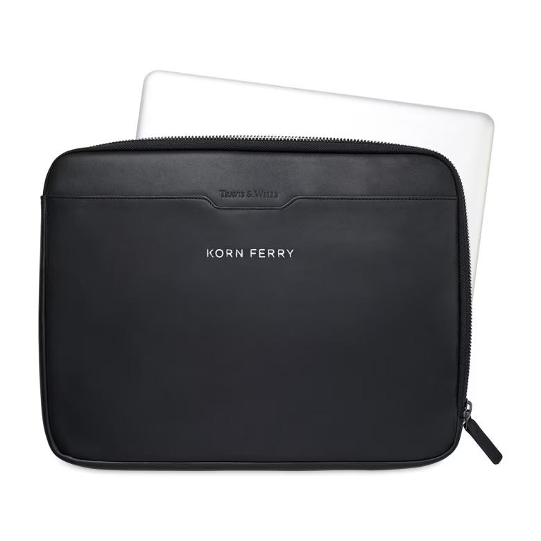 Protect your tech in polished style with the Travis & Wells® Envoy Laptop Sleeve, designed for professionals who value both form and function. Crafted from soft top-grain leather, it delivers a premium look while safeguarding laptops up to 16 inches—perfect for workdays, business travel, and daily commutes. The smart L-shaped opening makes sliding your laptop in and out effortless, while a suede-lined tech pocket keeps phones or small devices protected. Finished with a sleek gunmetal zipper and front slash pocket for added organization, this PVC-free sleeve arrives in a premium branded gift box, making it an excellent choice for executive use or elevated corporate gifting.