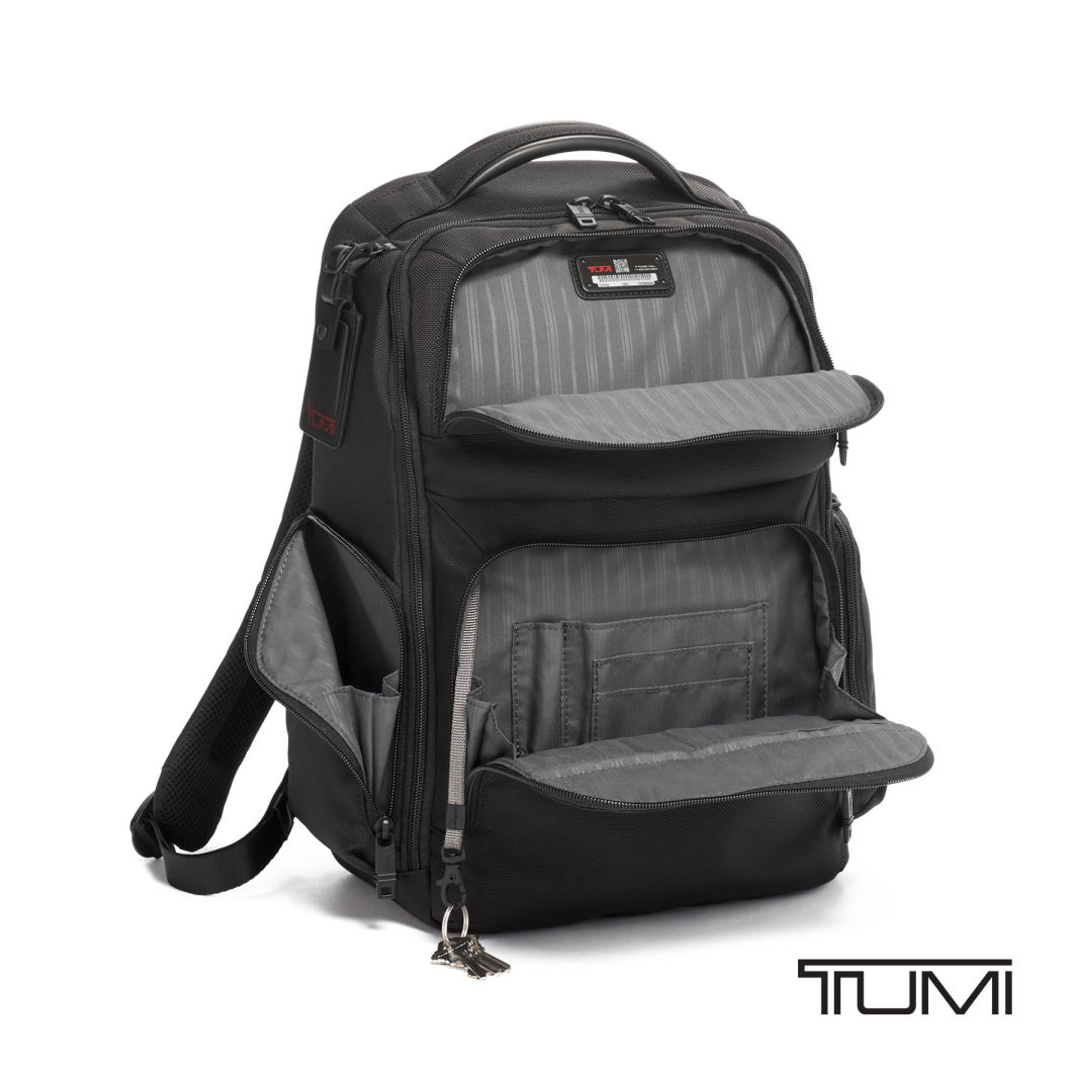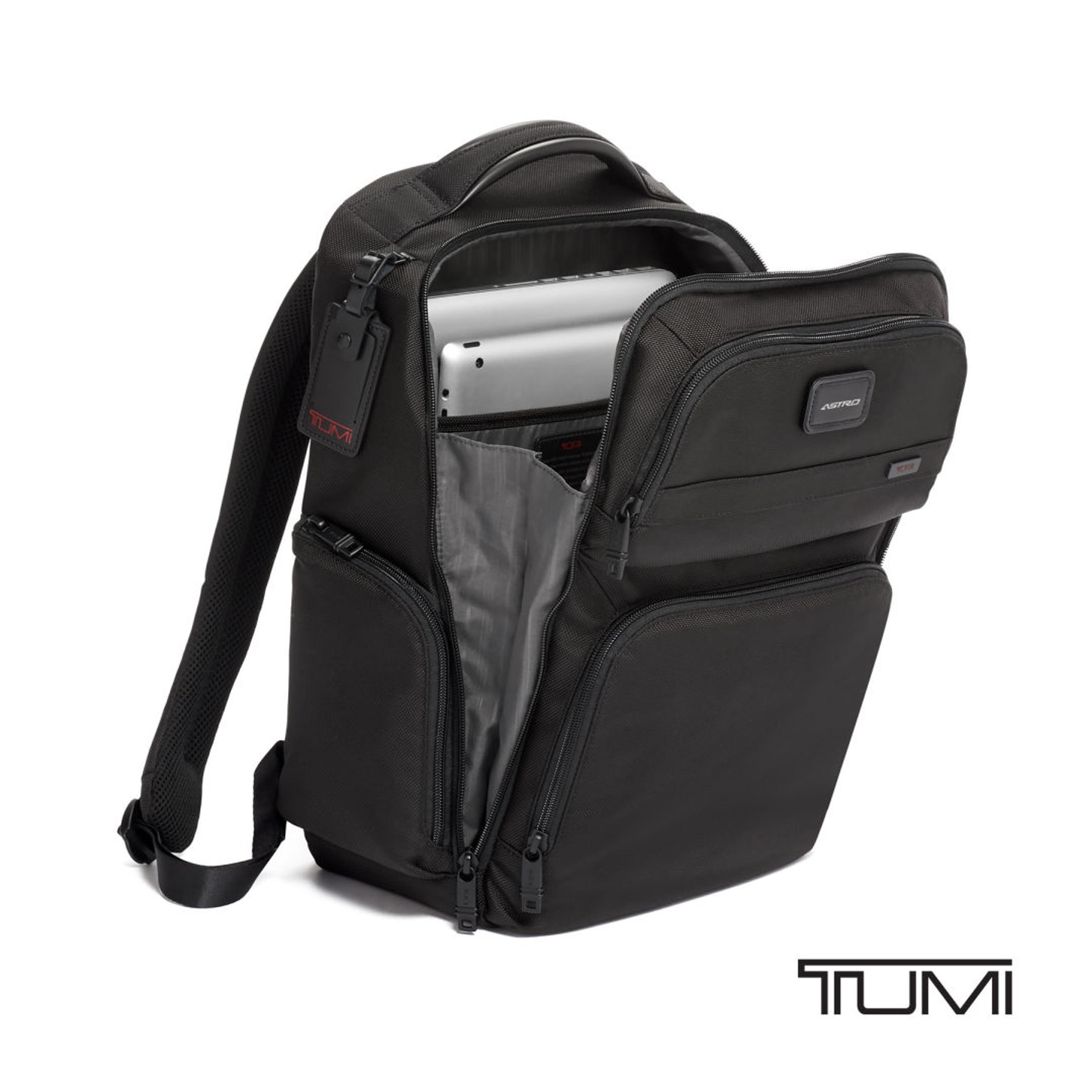Designed for professionals on the move, the TUMI Corporate Collection Backpack delivers durability, smart organization, and polished style. Crafted from rugged ballistic nylon, this backpack stands up to daily commutes while keeping work essentials secure and easy to access. Padded compartments protect your laptop and iPad, while dedicated pockets for business cards, media devices, pens, and documents keep everything perfectly organized. Comfort-focused padded backpack straps and a leather-accented top handle make carrying effortless throughout the day. Multiple exterior zip pockets provide quick access to frequently used items, making this backpack ideal for commuting, business travel, and corporate gifting.