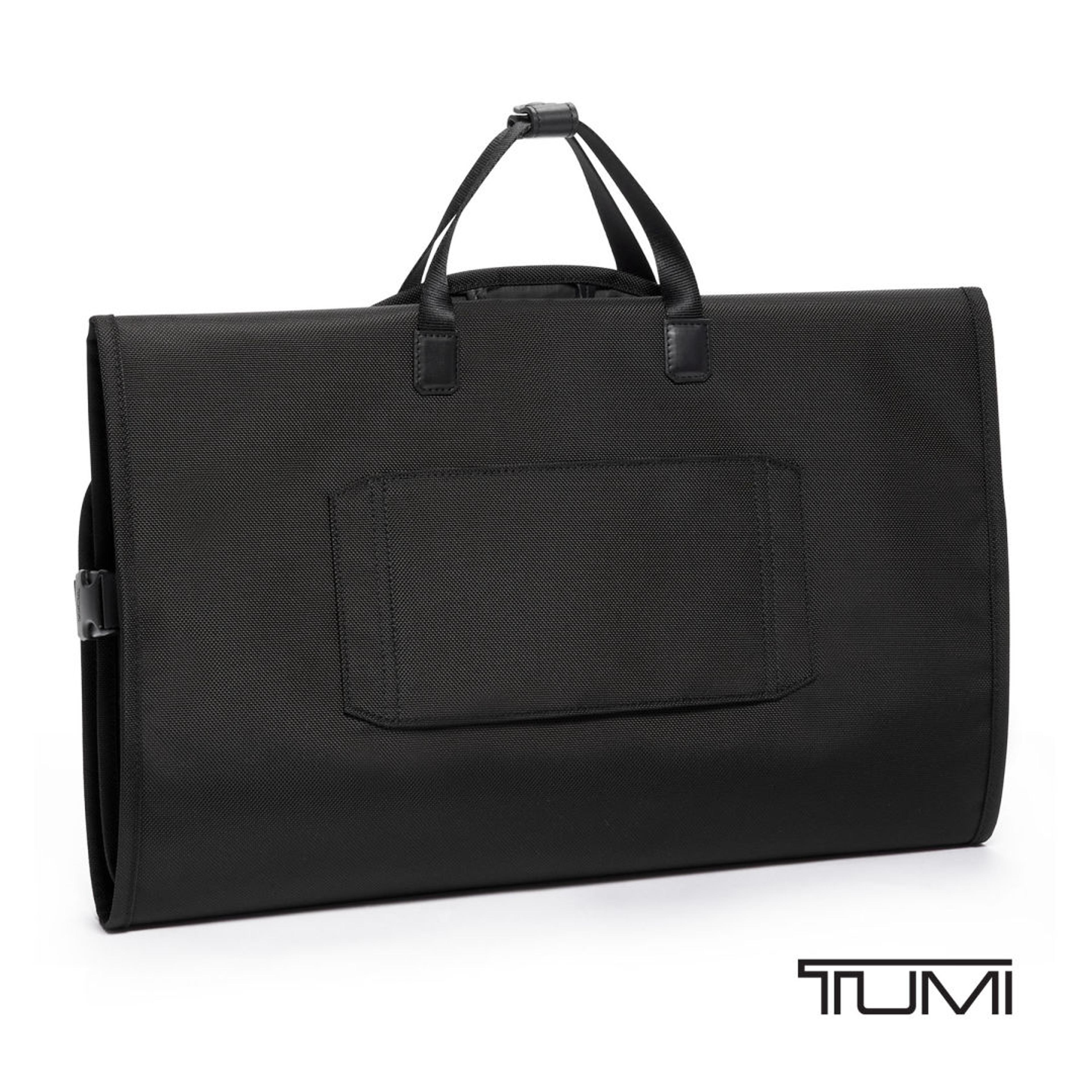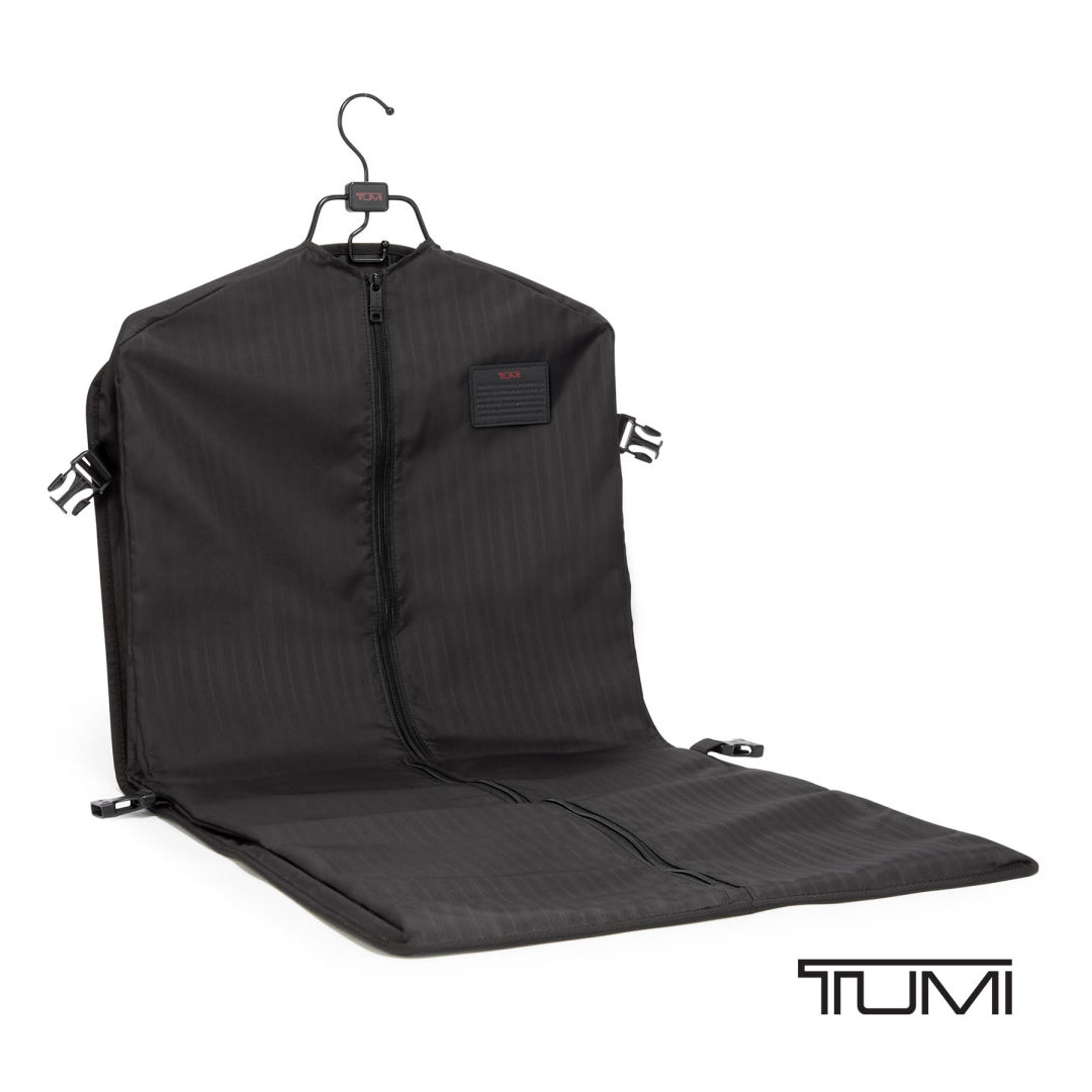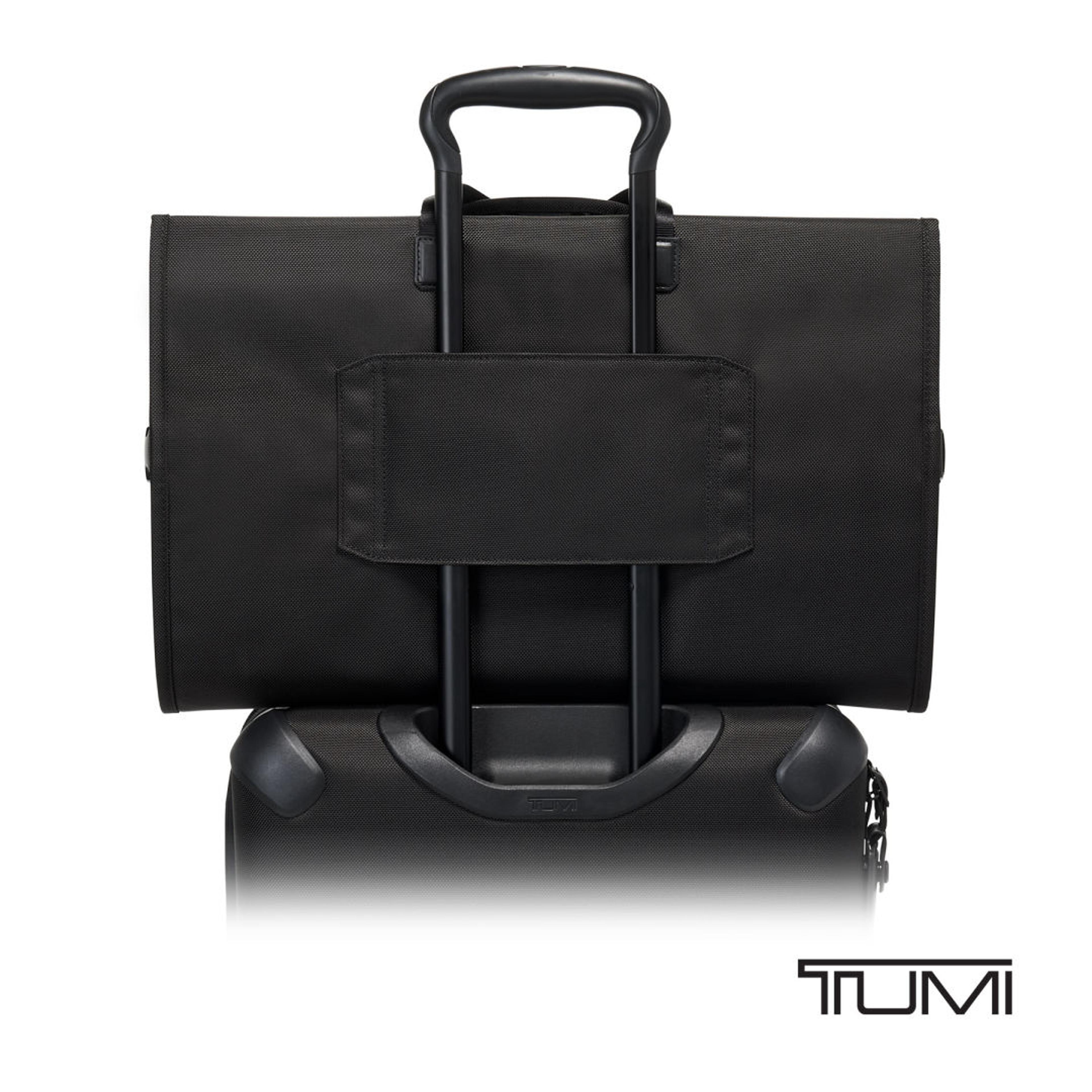Arrive looking polished with the TUMI Corporate Collection Garment Bag, designed to keep suits and formal wear protected while traveling. The full zip closure opens wide for easy packing, helping garments stay smooth and ready to wear. Top carry handles offer grab-and-go convenience, while the Add-A-Bag sleeve slides securely over a rolling suitcase handle for hands-free travel. Ideal for business trips, conferences, and formal events, this sleek garment bag includes a matching luggage tag for easy identification and delivers the smart organization and professional style TUMI is known for.