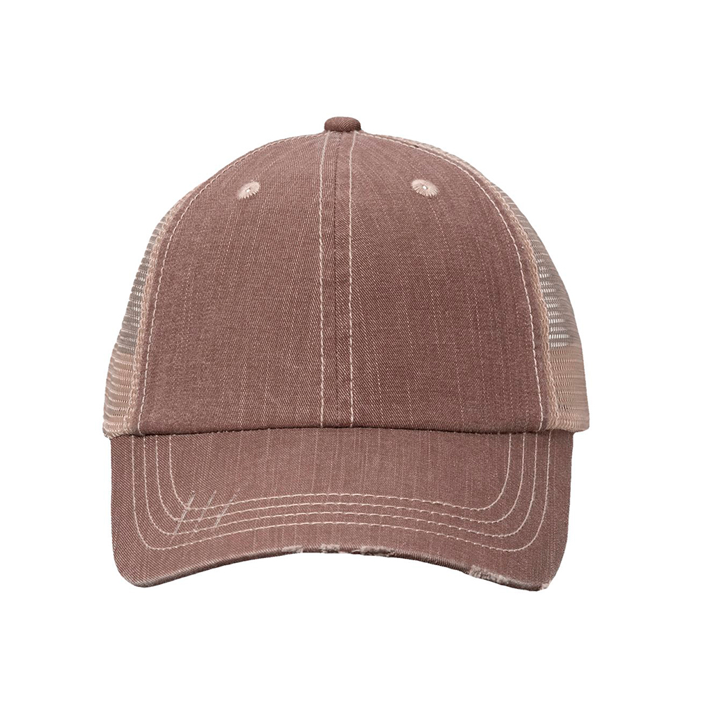 This unstructured, six-panel hat features a low-profile design crafted with 100% herringbone cotton and a breathable 100% polyester mesh back. The pre-curved visor includes contrast stitching and a frayed edge for a worn-in, casual look. A hook-and-loop closure ensures an adjustable, secure fit. Perfect for everyday wear with a blend of comfort, texture, and laid-back style.
