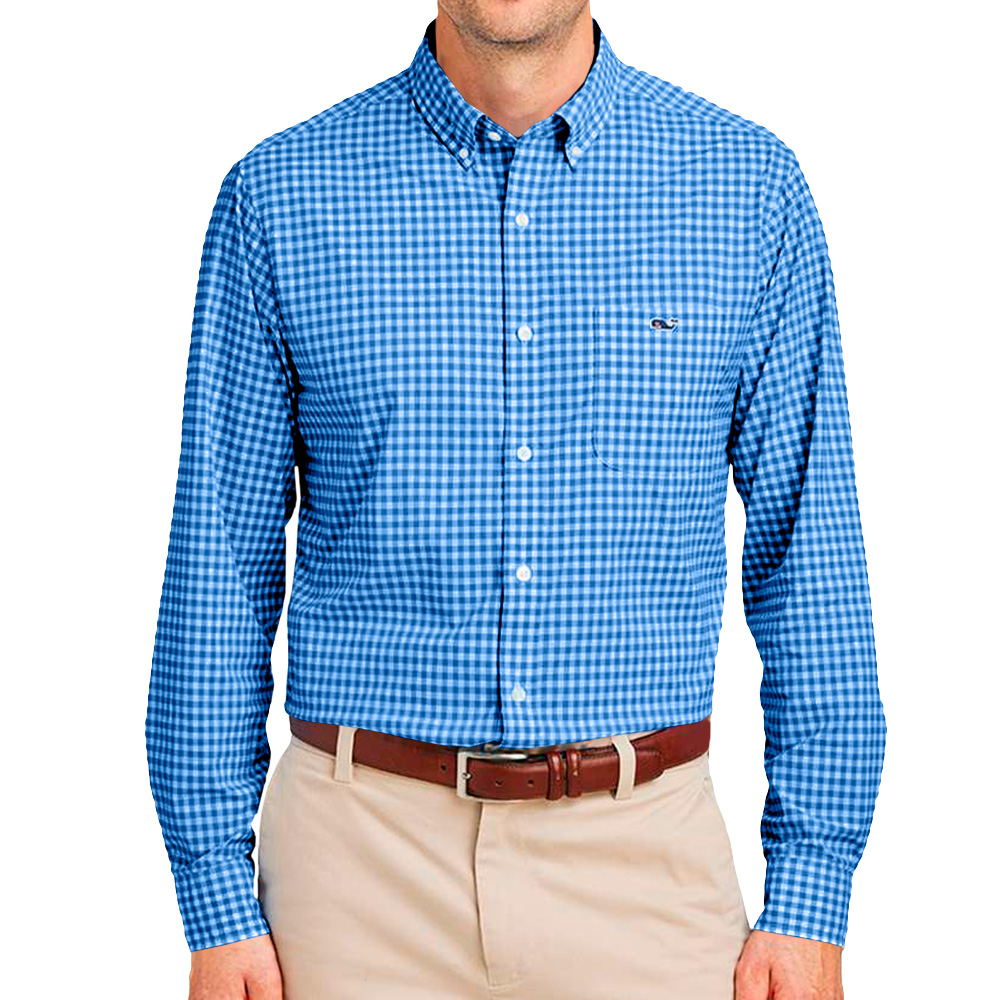 Crafted from a high-performance nylon blend with 91% spandex and 9% nylon, this shirt offers lightweight comfort with moisture-wicking and quick-drying capabilities. Built-in stretch ensures ease of movement without sacrificing structure. The classic fit is tailored with a slimmer chest and trimmed sleeves for a clean, modern silhouette. Finished with buttoned barrel cuffs and a whale embroidered on the chest pocket for a refined signature detail.