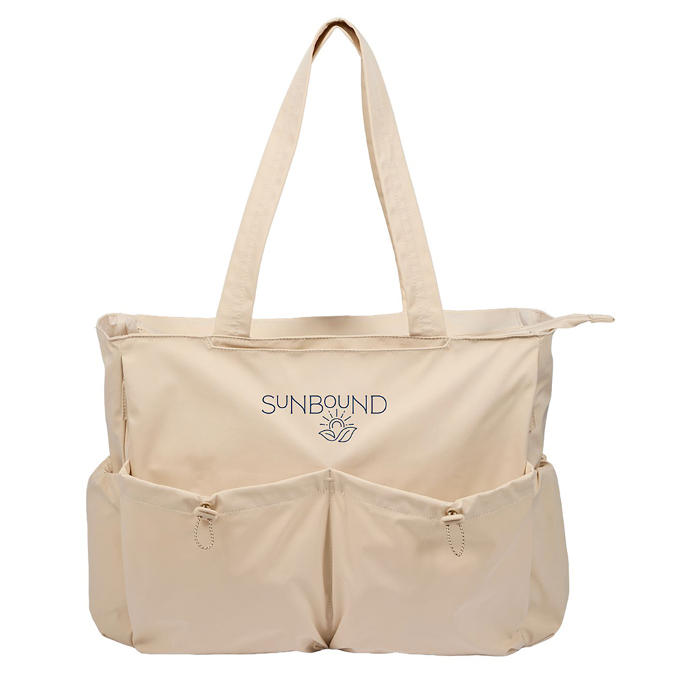 Go from commute to workout with the Wellable™ Large Recycled Sport Tote—an eco-friendly tote bag designed for organized, on-the-go living. The spacious zippered main compartment holds gym gear, travel essentials, and daily must-haves, while a padded laptop sleeve protects devices up to 17". Hidden side zippers expand into a full-length pocket, giving you an easy spot for a yoga mat, towel, or extra layers. Front cord-closure pockets, an interior hook-and-loop valuables pocket, and dual side bottle pockets keep everything in its place. A built-in trolley sleeve makes airport travel effortless, and recycled materials support a more sustainable routine. Plus, every purchase gives back through 1% For The Planet.