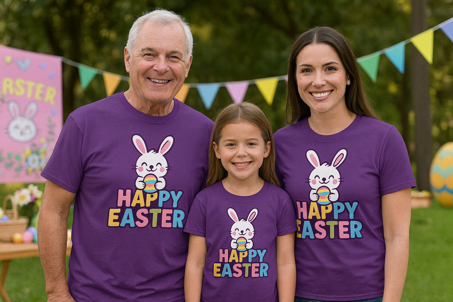 It’s easy to create personalized Easter shirts that stand out. Just pick a shirt style, upload your own artwork or use our seasonal clipart and text tools, and preview your design in real time. You can go cute, funny, or faith-based—it’s all up to you. Once your design looks perfect, we’ll print and ship it fast. Whether it’s one shirt for a basket surprise or a full set for your family photo, we’ll help you get it done on time.