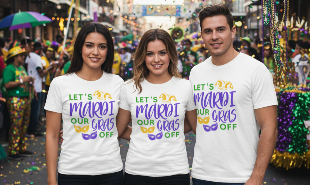 Custom Mardi Gras shirts help your group stand out while celebrating the energy and tradition of carnival season. Create shirts for parades, parties, krewes, school events, travel groups, and community celebrations. Add beads, masks, crowns, and other festive artwork for a design that matches the excitement of Mardi Gras.