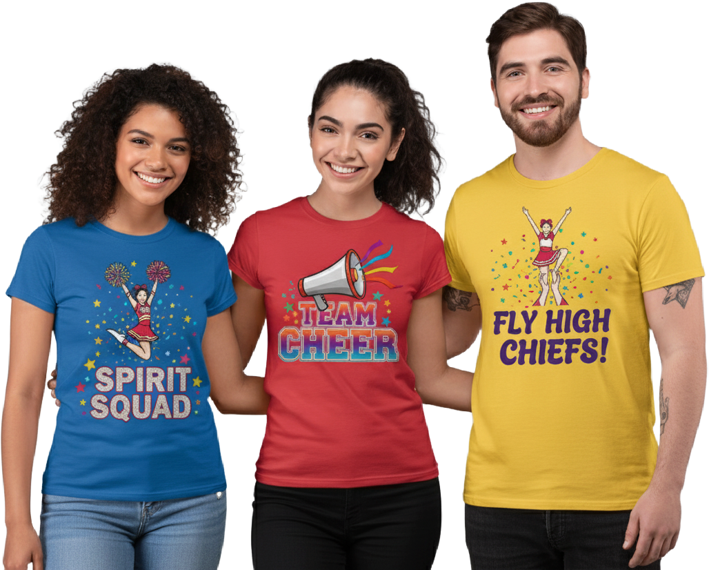 Design personalized cheer shirts for your squad, competitions, or spirit events. No minimums, fast turnaround, and free shipping.