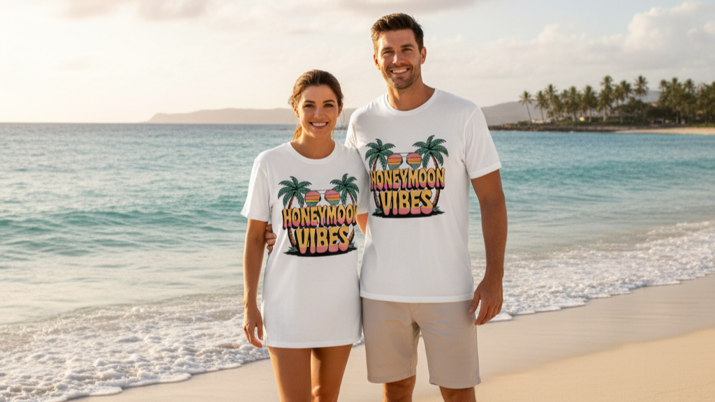 We create our custom honeymoon shirts using screen printing or HD digital printing, primarily based on the product selected, type of design, and quantity. Both methods result in a high-quality print that you'll love.